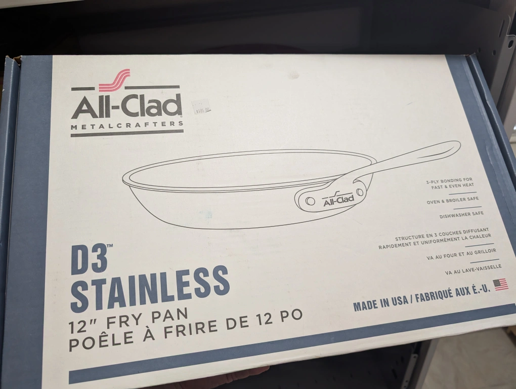 Selling used All-Clad D3 Stainless 12" Fry Pan. Very large pan. Brand new in box This is a high-quality stainless steel fry pan from All-Clad's D3 series. Perfect for all your cooking needs! More info from maker: https://www.all-clad.ca/en/d3-stainless-3-ply-bonded-cookware-fry-pan-12-inch.html Retails for $180+
