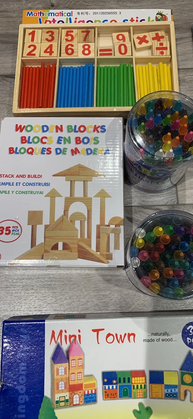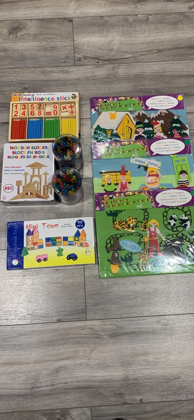 10All brand New Brand New Educational counting and building blocks, jumbo crayons, Felt board with cut outs A 32 piece wooden block set. Featuring a colorful mini town design with buildings and vehicles. They would be great for playtime. 3 felt boards with cut outs 1 small plain building block set 1 math counting blocks and sticks 2 jumbo crayons set