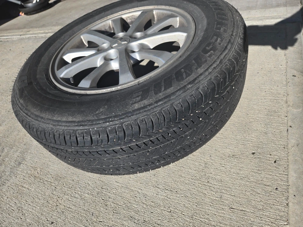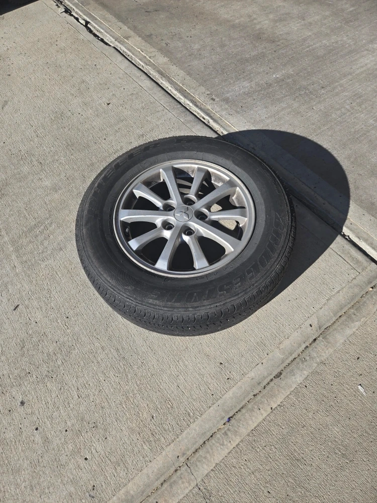 14Selling a used Bridgestone tire mounted on a Mitsubishi rim. The tire size is 215/70R16. It shows signs of wear, as seen in the photos, but still has some life left in it. Great for a spare or temporary replacement!