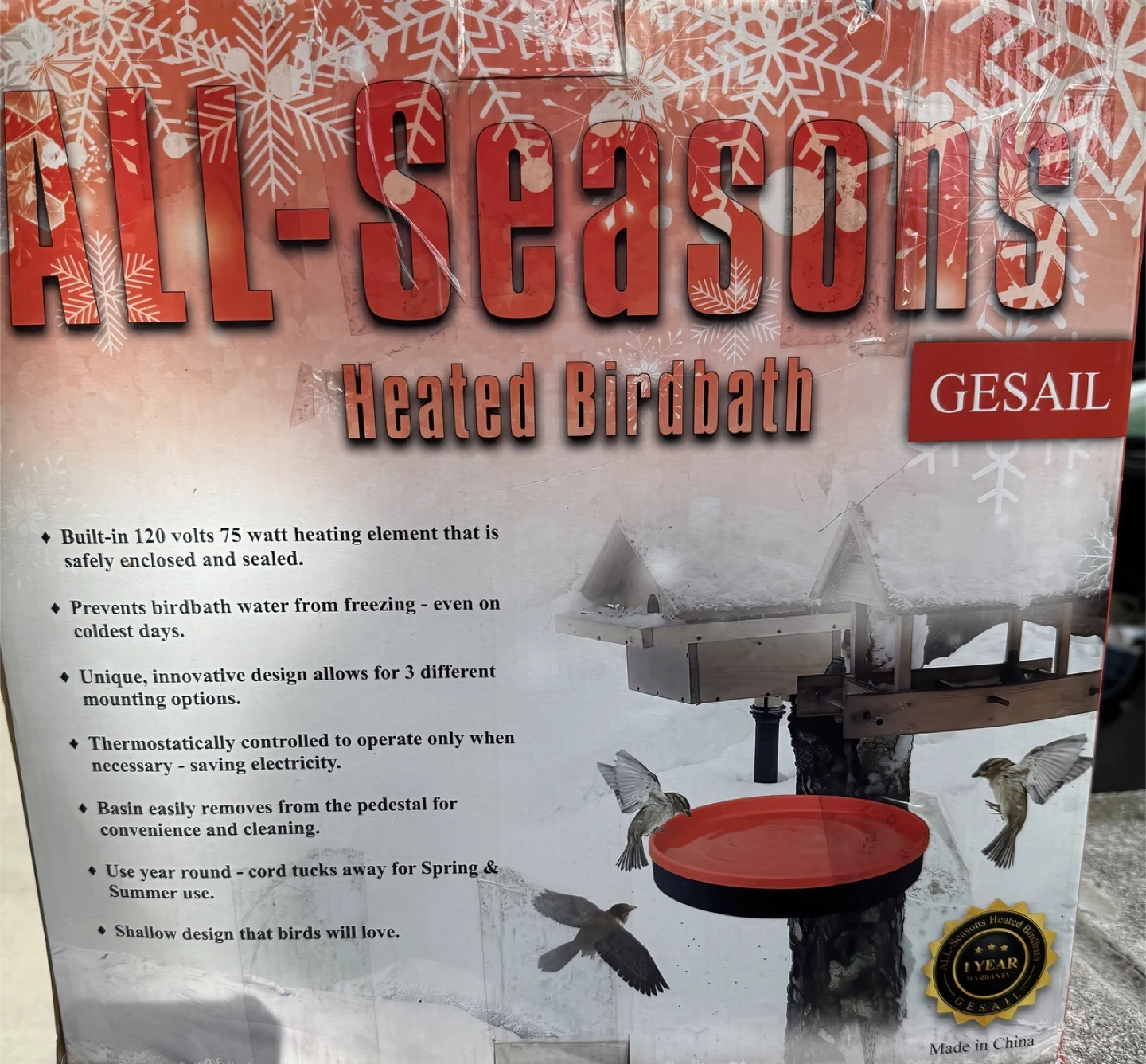 55Keep the birds happy all winter long with this heated birdbath! It features: - A built-in 120 volts 75 watt heating element that is safely enclosed and sealed - Prevents birdbath water from freezing, even on the coldest days - Unique design that allows for 3 different mounting options - Thermostatically controlled to operate only when necessary, saving electricity - Basin easily removes from the pedestal for convenience and cleaning - Can be used year-round with a cord that tucks away for Spring & Summer use - Shallow design that birds will love Comes with a 1-year warranty