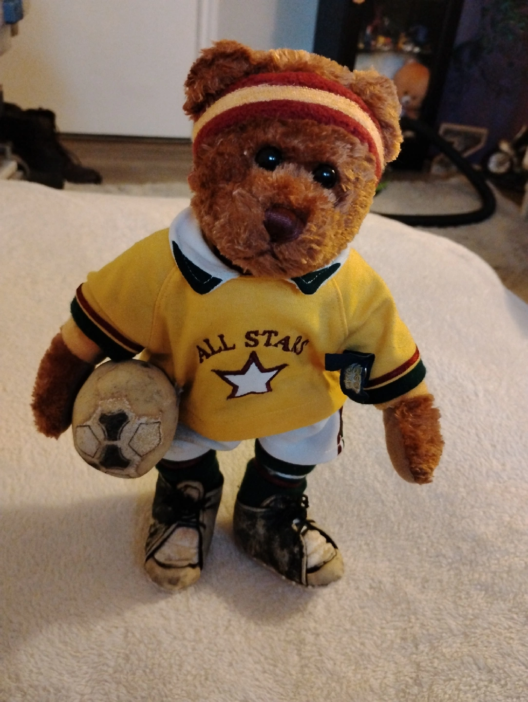 60Selling a cute teddy bear dressed in an All Stars soccer uniform! The bear is holding a soccer ball and is ready for a new home. Perfect for a child's room or as a collectible item