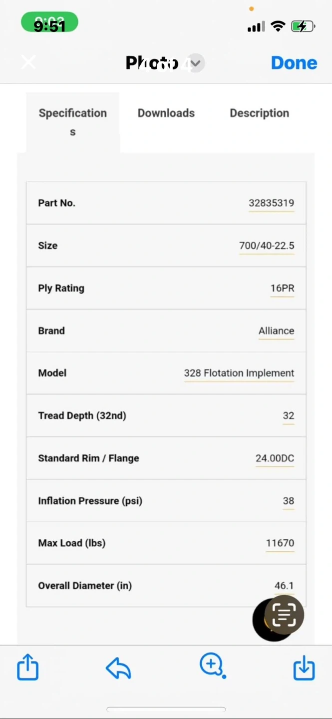 18Selling an Alliance 328 Flotation Implement tire. Size: 700/40-22.5 Ply Rating: 16PR Tread Depth (32nd): 32 Standard Rim/Flange: 24.00DC Inflation Pressure (psi): 38 Max Load (lbs): 11670 Overall Diameter (in): 46.1