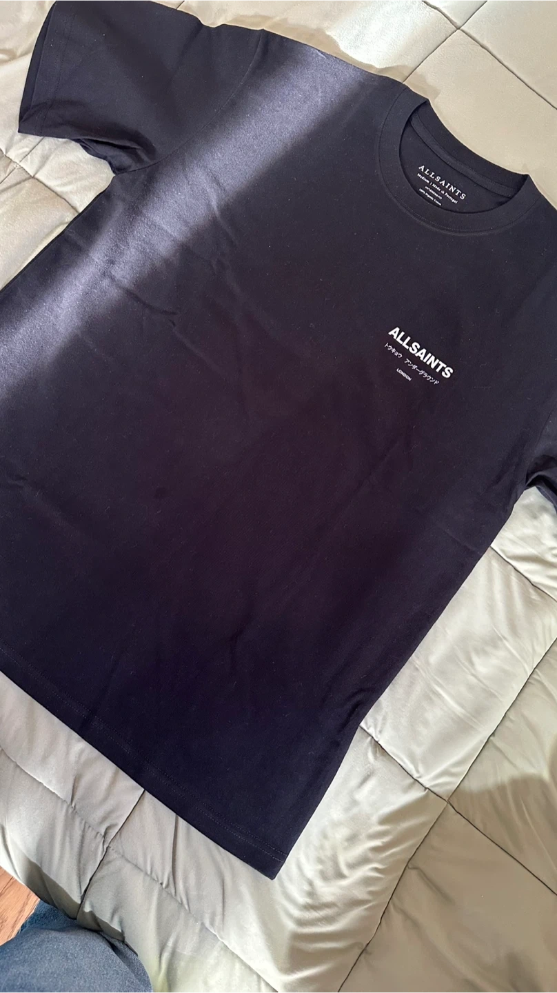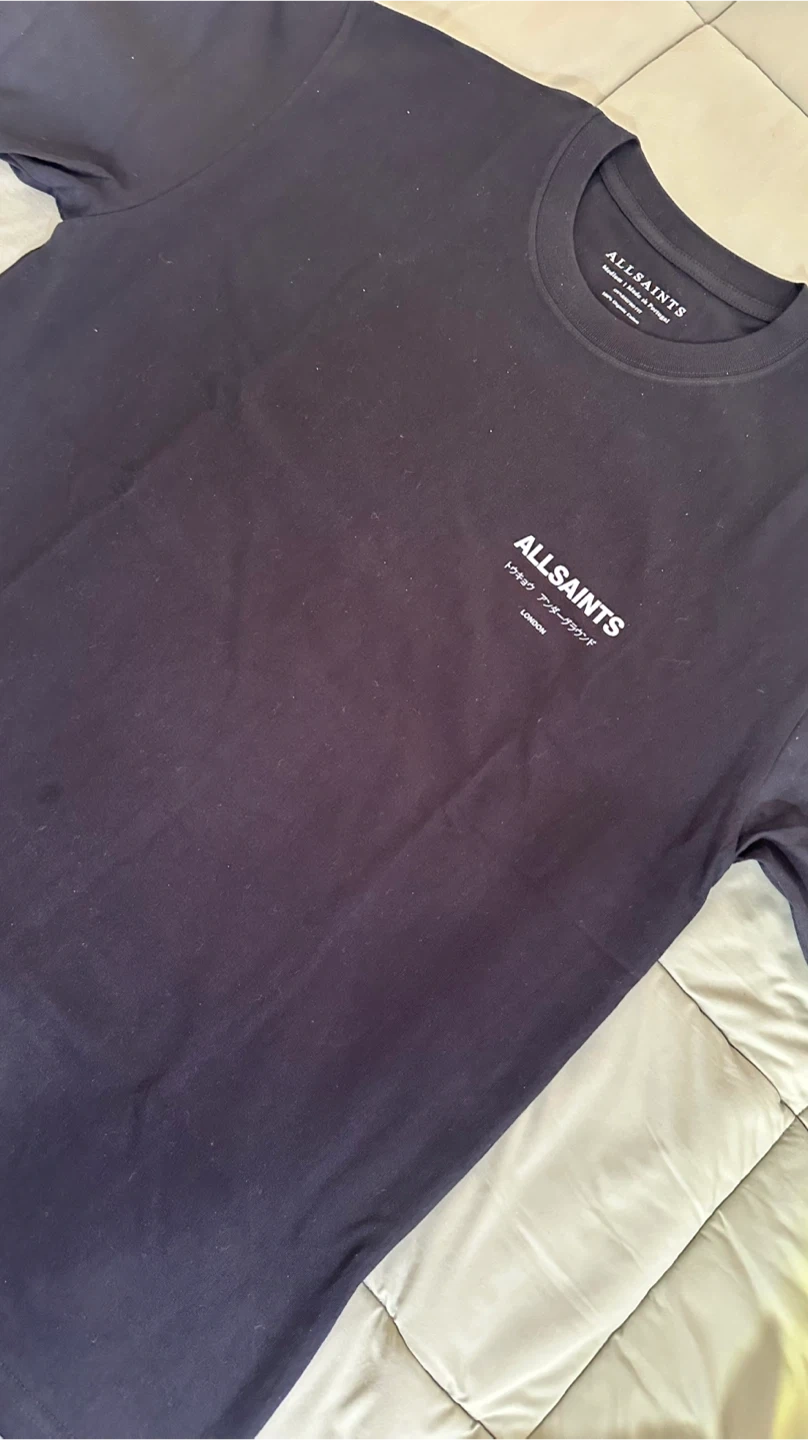 Selling an AllSaints black T-shirt. It features 'ALLSAINTS' with 'LONDON' printed below on the front and back. Great for casual wear!
