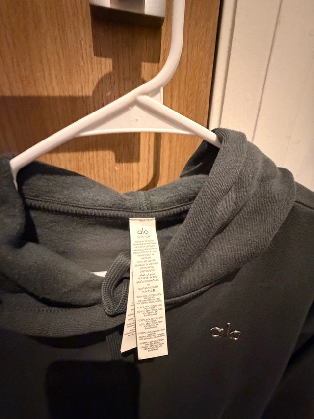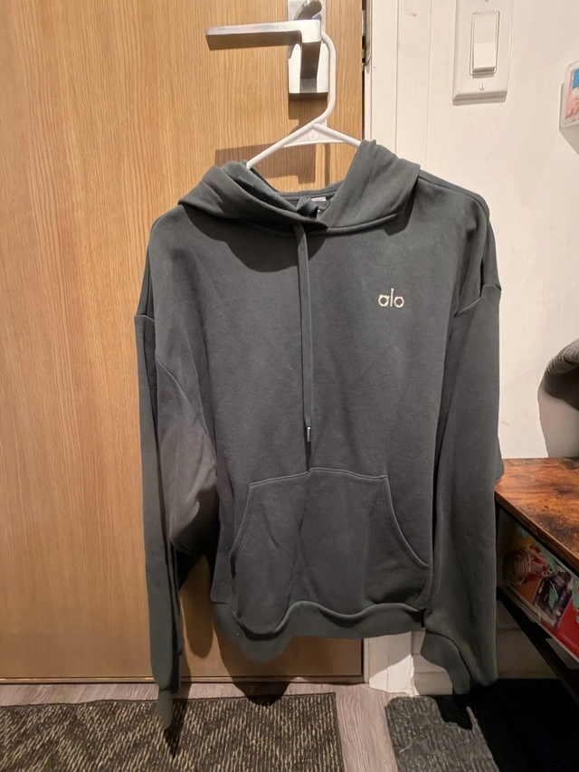60Snuggle up in this gently worn Alo hoodie, perfect for those post-workout chills or a casual day out. This cozy hoodie features a relaxed fit and the signature Alo logo. It's in great condition and ready for a new home. * Brand: Alo * Size: S * Colour: Charcoal Green Original price $178 If the ad is up, it's available!
