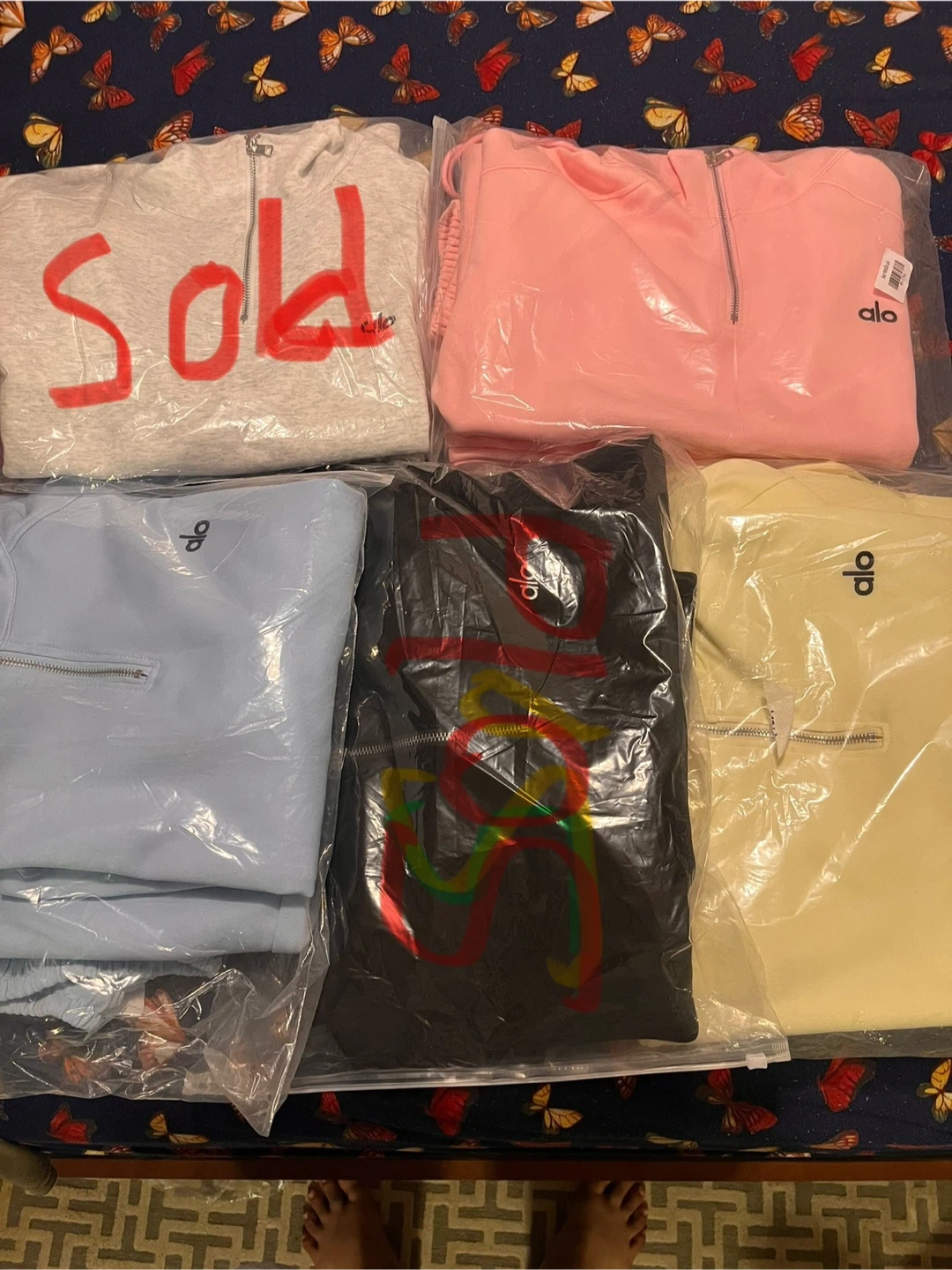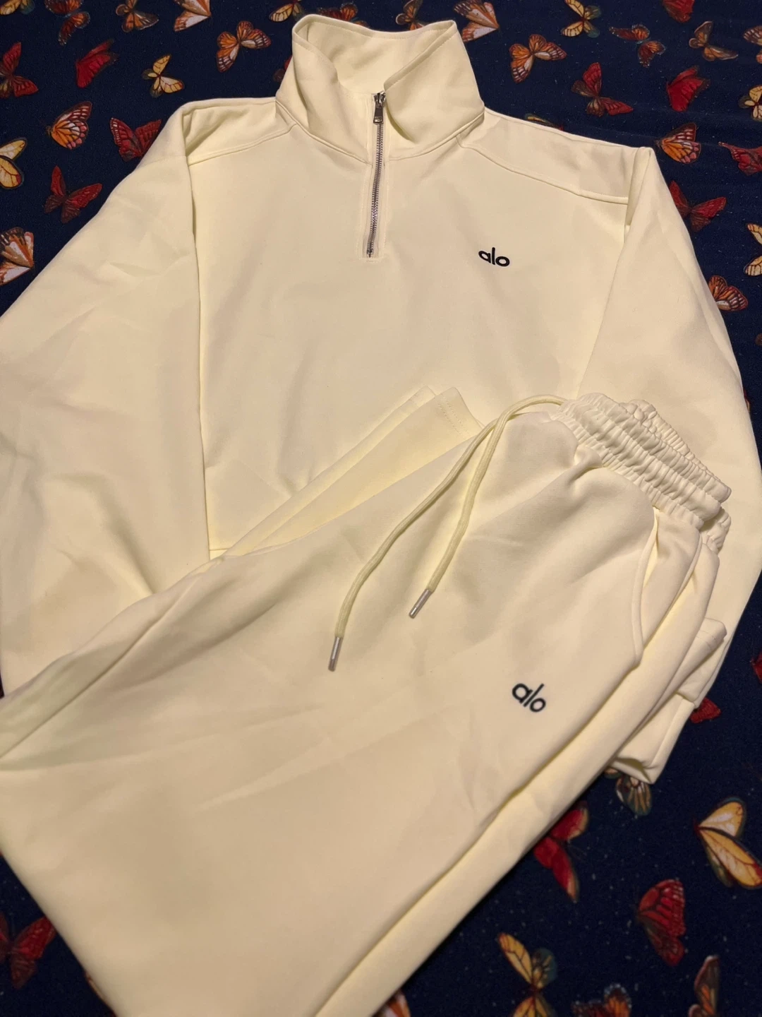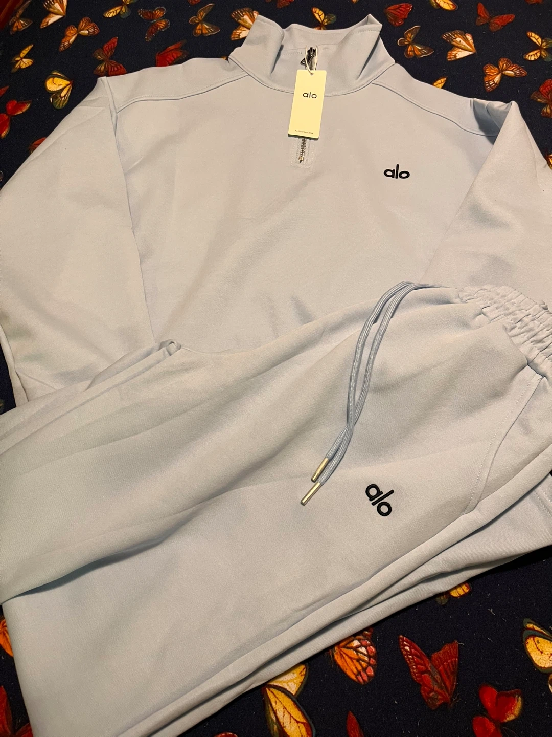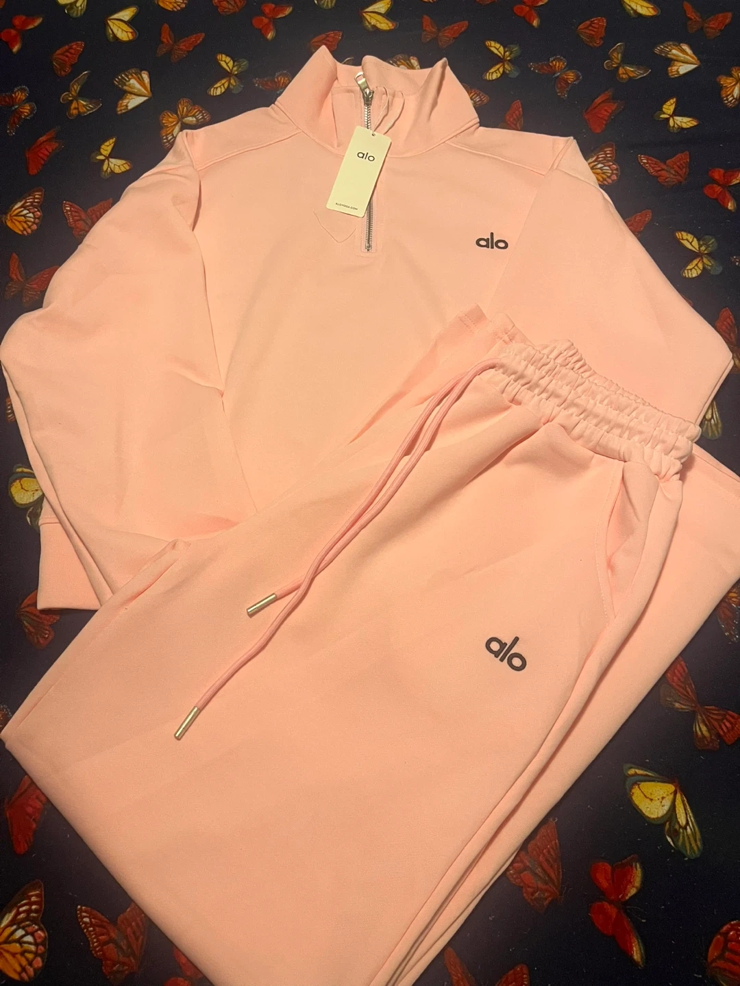 Selling a comfy ALO yoga set! The set includes a 1/4 zip pullover and matching sweatpants. Perfect for lounging or hitting the studio. Available in light blue, peach, and yellow!