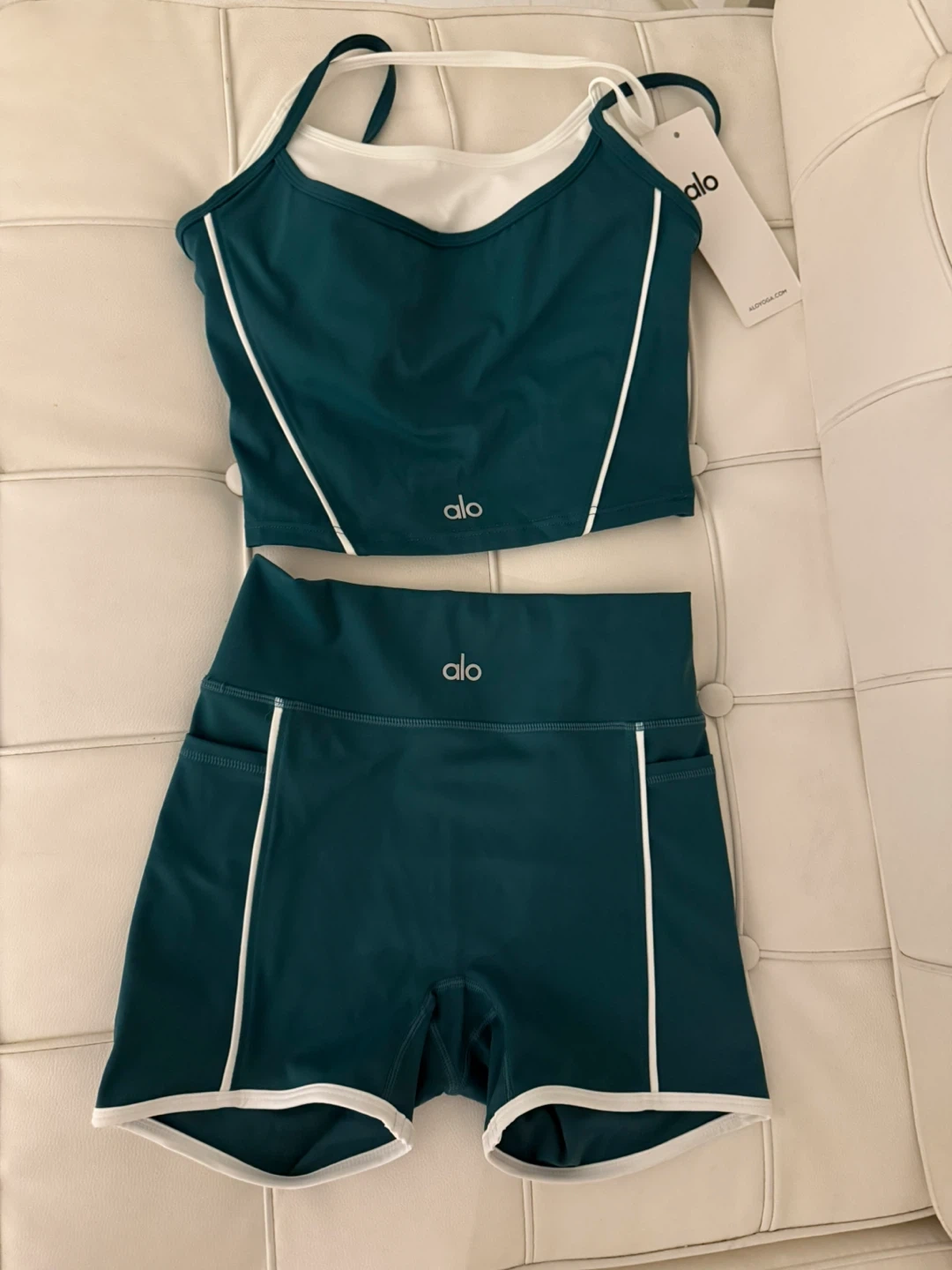 67Selling a super cute Alo Yoga set! The set includes a teal top with white trim and matching teal shorts, also with white trim. Perfect for workouts or just lounging around. The fabric is soft and comfortable!