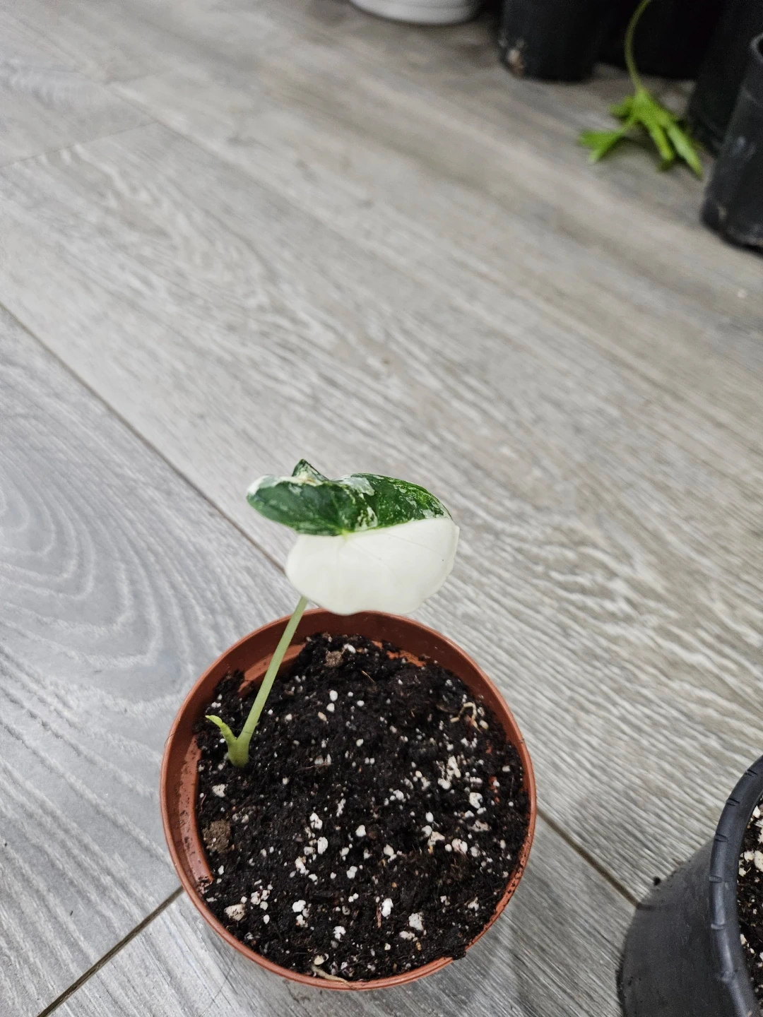 705Selling an Alocasia frydek plant. It's a beautiful plant with striking white and green foliage. It is currently in a small pot and ready to bring some greenery to your space