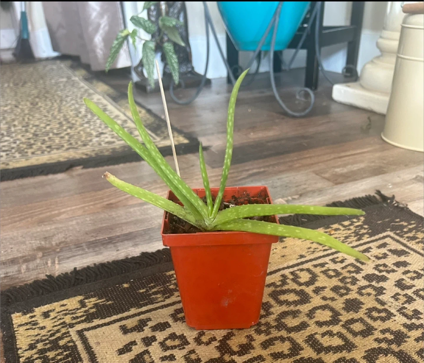 I'm selling an aloe vera plant in a cute orange pot! It's a healthy little plant, perfect for adding some greenery to your space. It's currently in a small pot and ready to thrive in your home