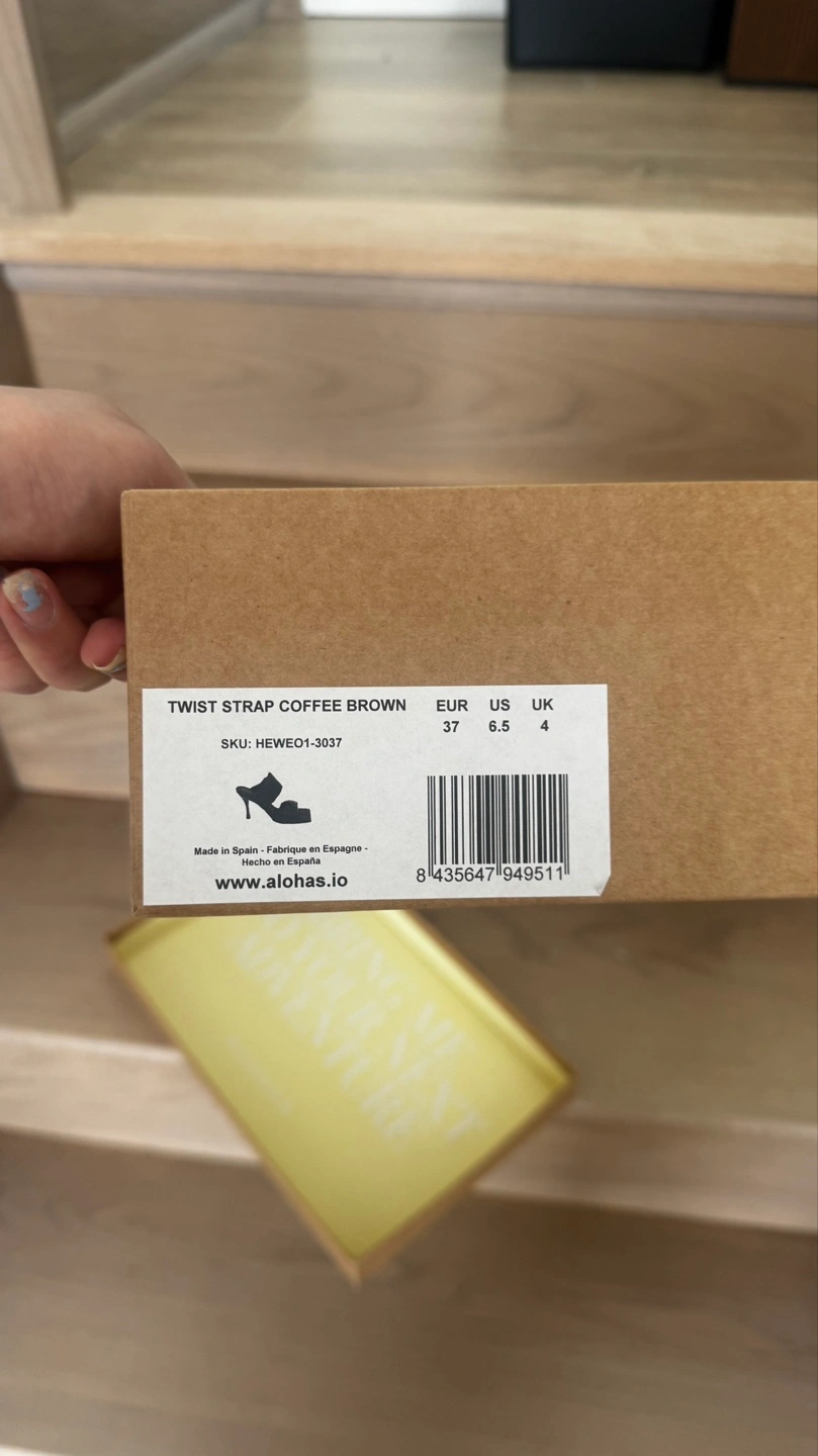 17Brown leather high heels. Unique twist strap design. Size 37 (US 6.5, UK 4). Made in Spain. In original box.