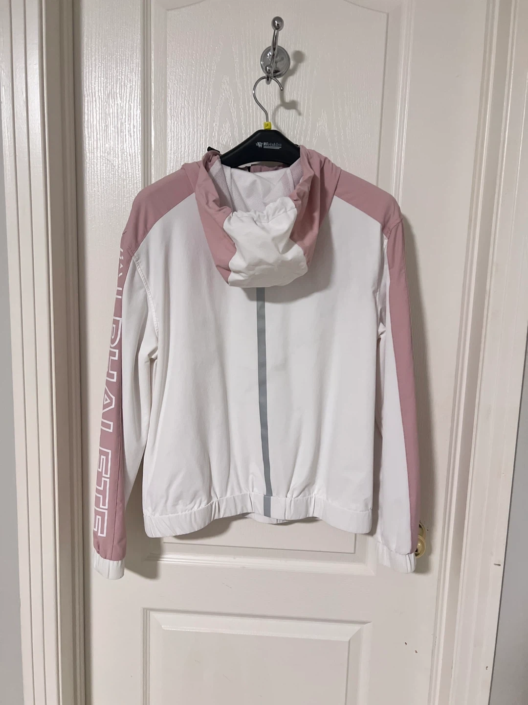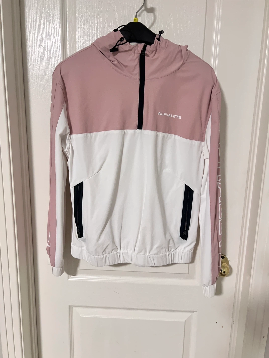 10Selling an Alphalete pullover jacket in size small. It's a stylish white and pink colour block design. The material is 92% nylon and 8% elastane, making it comfortable and flexible. Perfect for workouts or casual wear!