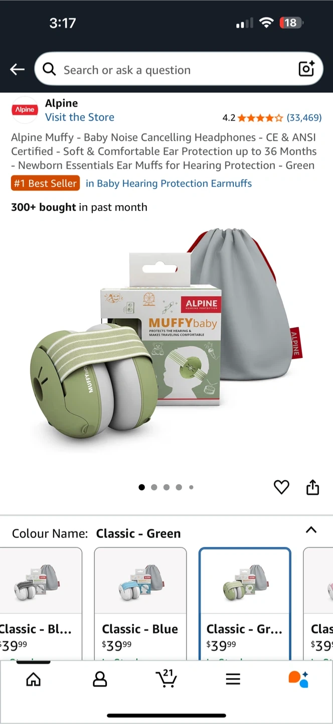 10Keep your little one's ears safe with these Alpine Muffy Baby noise-cancelling headphones! They're classic green and adjustable for up to 36 months. These are certified according to ANSI and CE regulations, with 23dB noise reduction. They are soft and comfortable ear protection, perfect for newborns! Never been used!!!!!