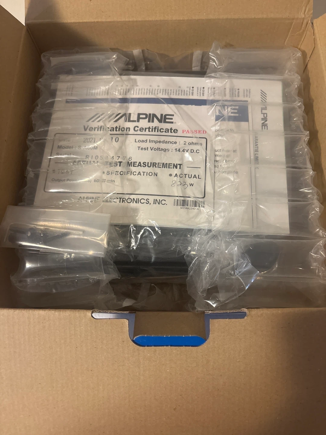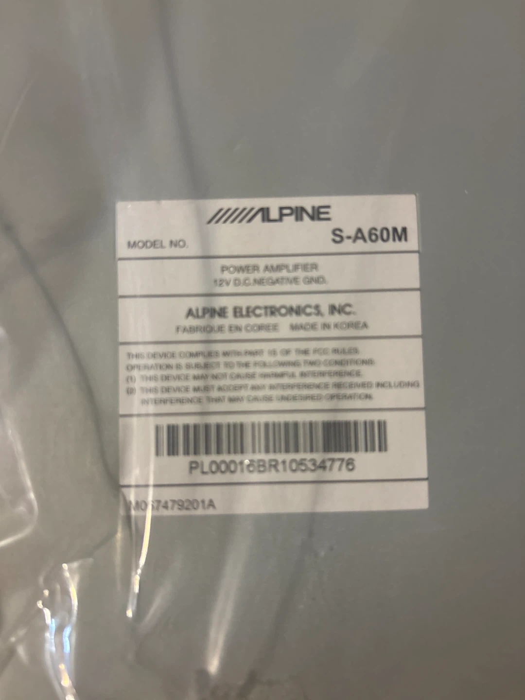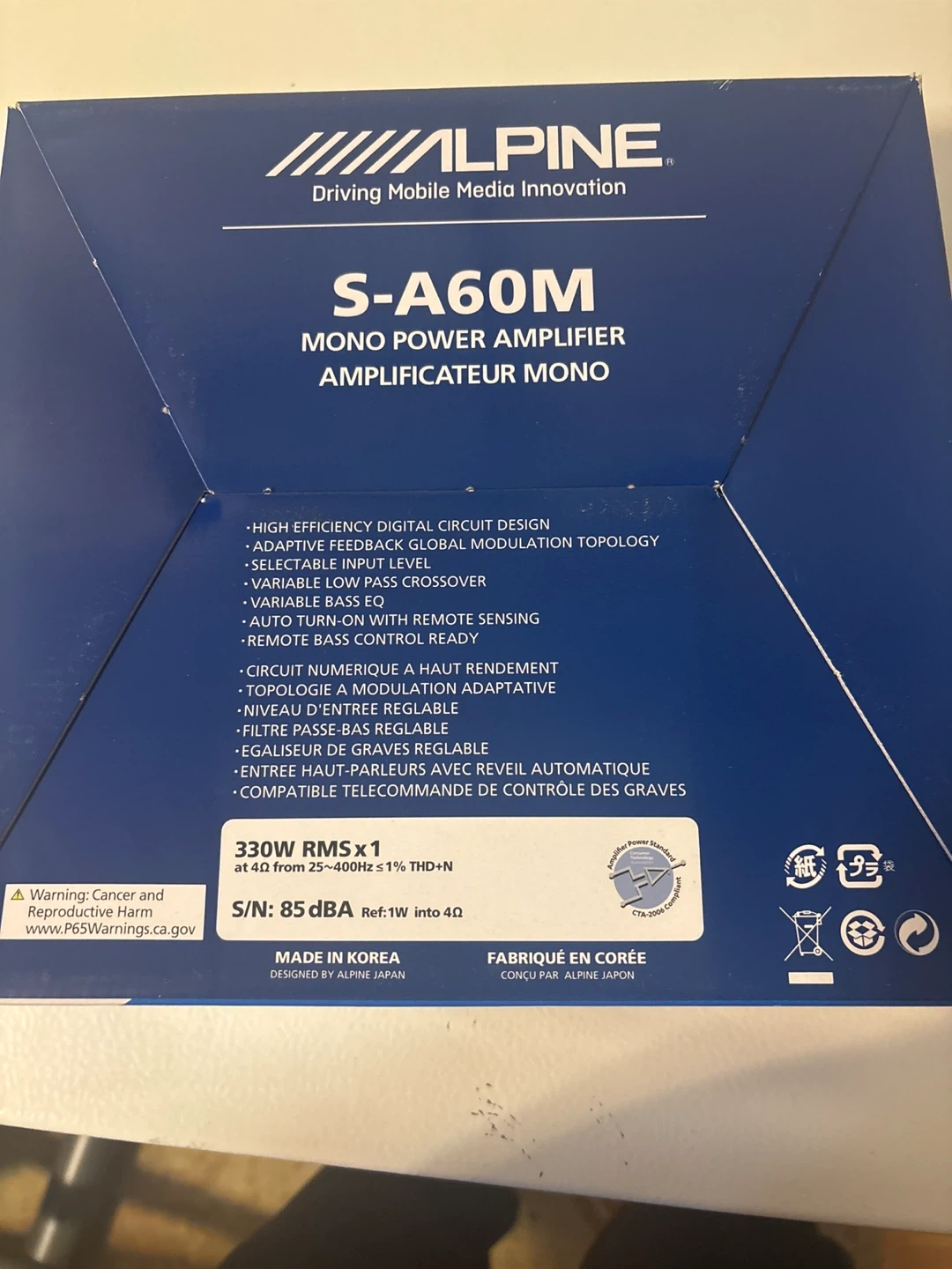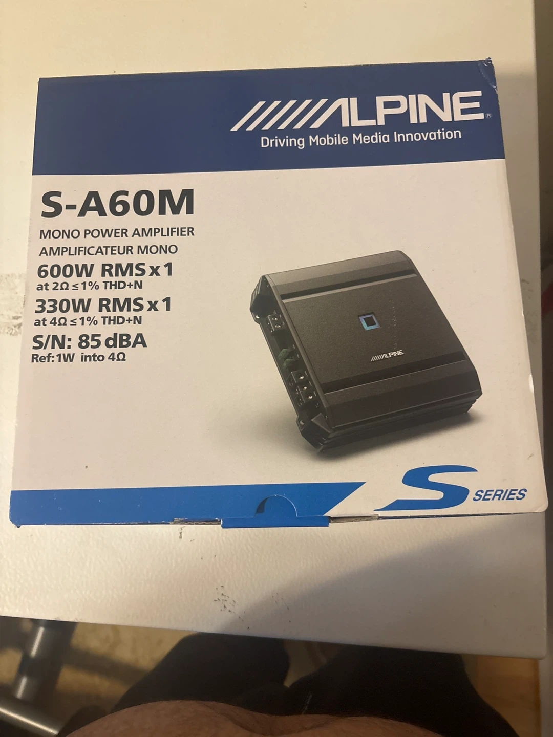 Selling a brand new Alpine S-A60M Mono Power Amplifier! It's still in its original packaging and has never been used. Key features: - High efficiency digital circuit design - Adaptive feedback global modulation topology - Selectable low pass crossover - Variable bass EQ - Auto turn-on with remote sensing - Remote bass control ready It delivers 600W RMS x 1 at 2 Ohms and 330W RMS x 1 at 4 Ohms. S/N: 85 dBA. The box is included!
