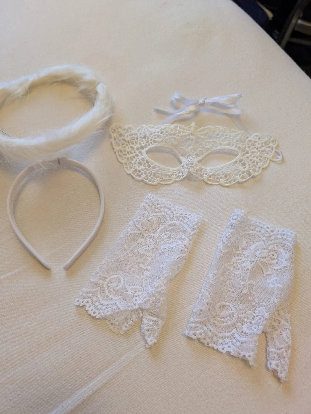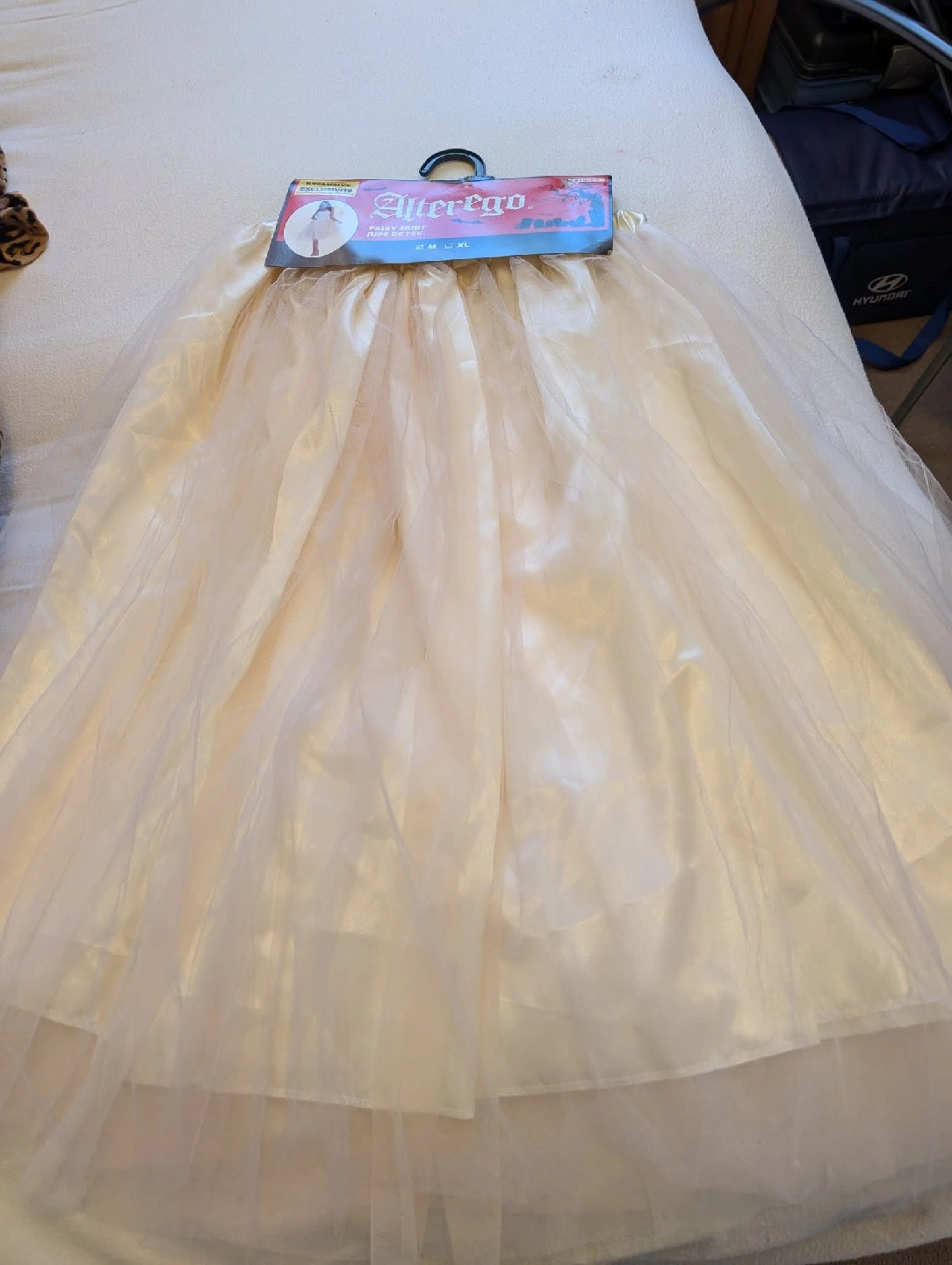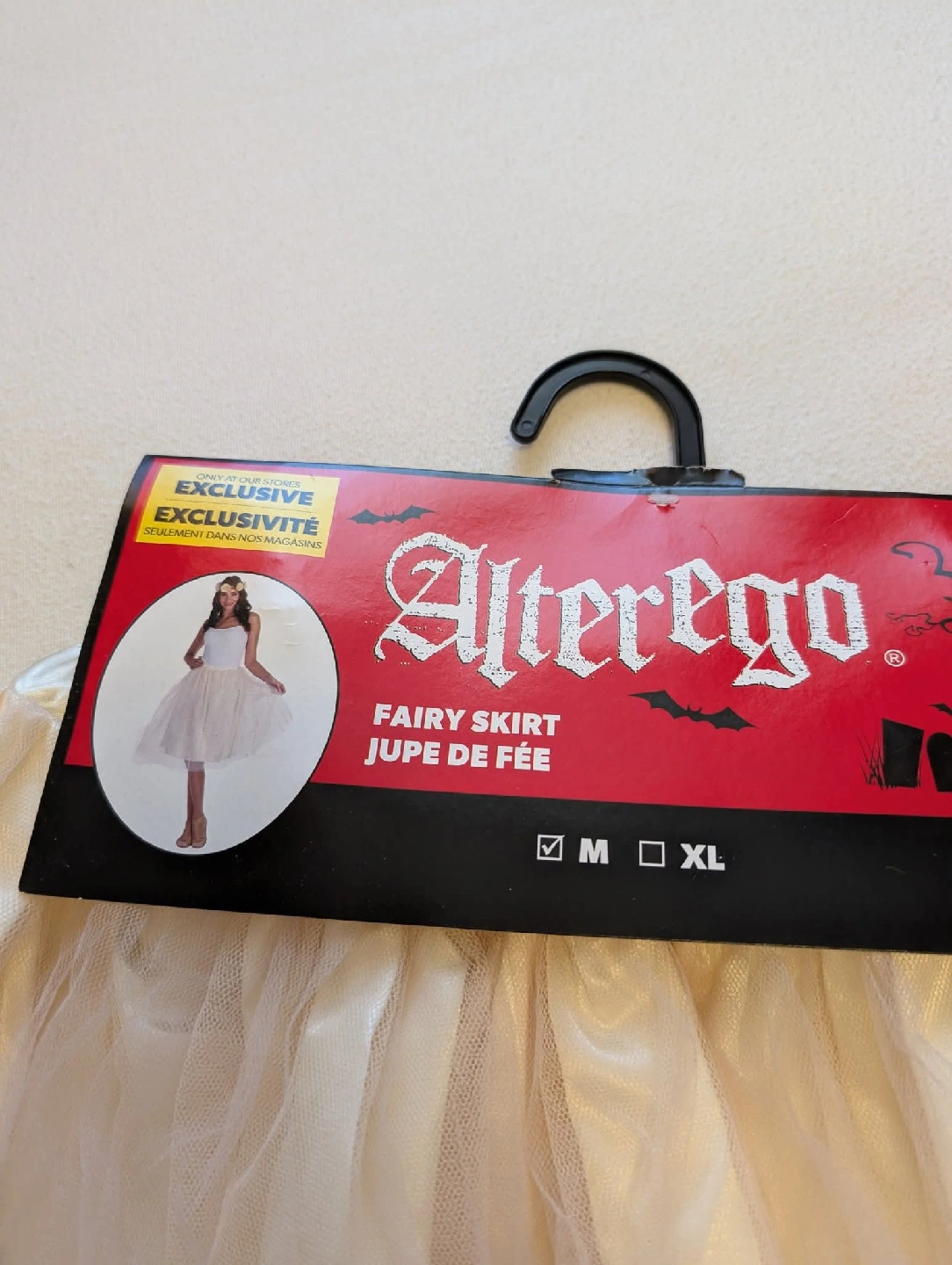 98Selling a complete fairy costume set by Alter Ego! This set includes a beautiful fairy skirt available in sizes M - XL, along with matching white accessories such as a mask, gloves, and a headband. Perfect for Halloween or costume parties!