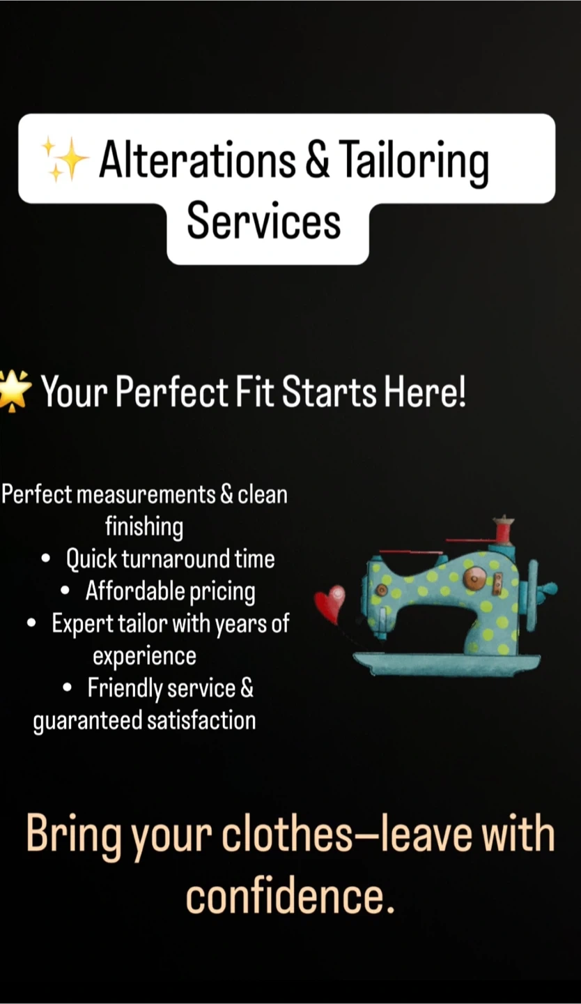36Offering alterations and tailoring services to help you achieve the perfect fit! Services include perfect measurements and clean finishing with quick turnaround time. Affordable pricing is available with an expert tailor with years of experience. Enjoy friendly service and guaranteed satisfaction! 👗 Our Services Women’s Alterations • Kurti, suit & salwar adjustments • Saree fall • Blouse stitching & alterations • Dress hemming / taking in / letting out • Zipper replacement • Skirt & top alterations Men’s Alterations • Pant hemming • Waist adjustments • Jacket/blazer fitting • Shirt tapering & sleeve corrections • Zip/button repair Specialty Alterations • Bridal & party wear fitting • Formal wear tailoring • Kids’ clothing adjustments • Custom stitching (on request) 🧵 Why Choose Us? • Perfect measurements & clean finishing • Quick turnaround time • Affordable pricing • Expert tailor with years of experience • Friendly service & guaranteed satisfaction ⸻ ⏱ Turnaround Time • Simple alterations: 1–2 days • Detailed fittings: 3–5 days Urgent service available Near Lake Pointe Park Hamilton L8E 6C6 DM for inquiries!!! Thank You