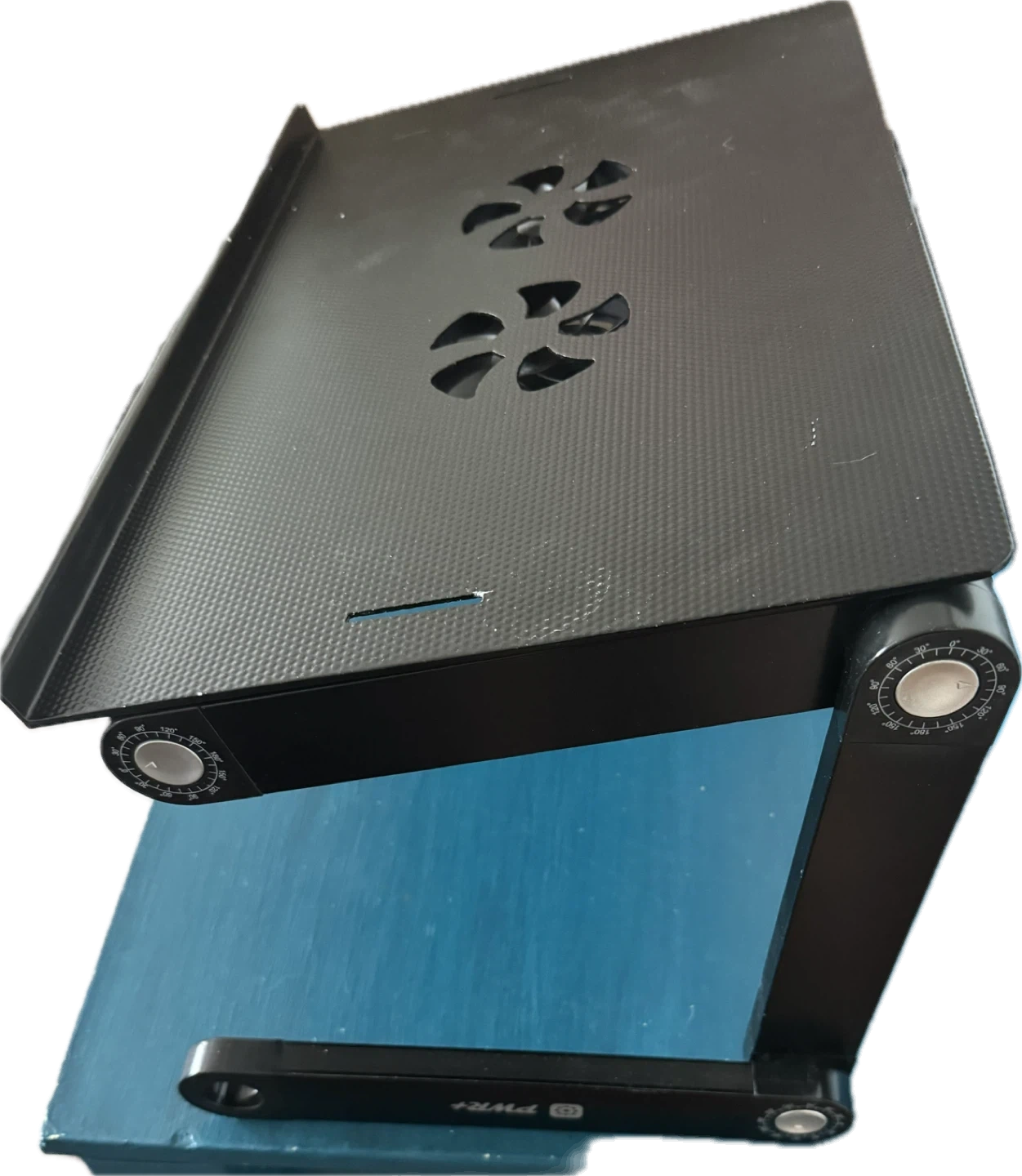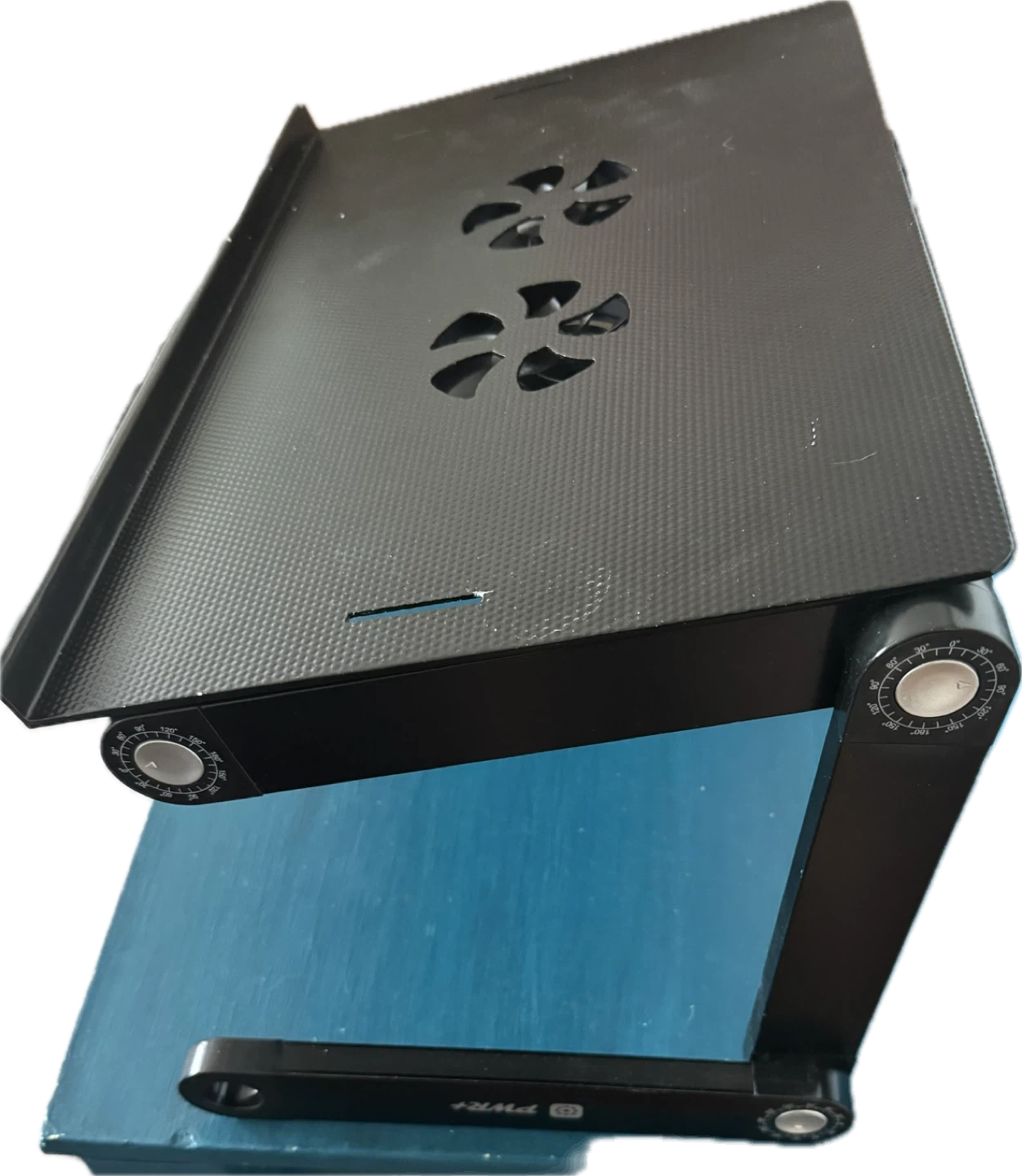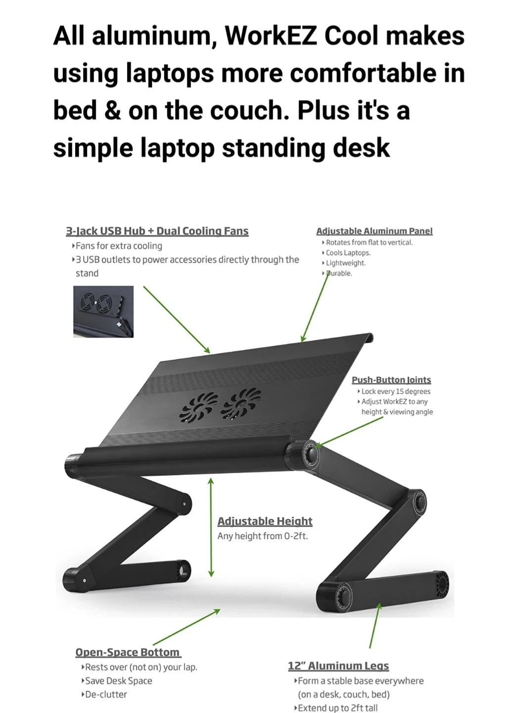 Get comfortable using your laptop in bed or on the couch with this adjustable laptop desk! It's made of aluminum and features adjustable height from 0-2ft. The 12" aluminum legs form a stable base on any desk, couch, or bed. It also includes dual USB charged cooling fans to keep your laptop cool and an optional mouse pad.