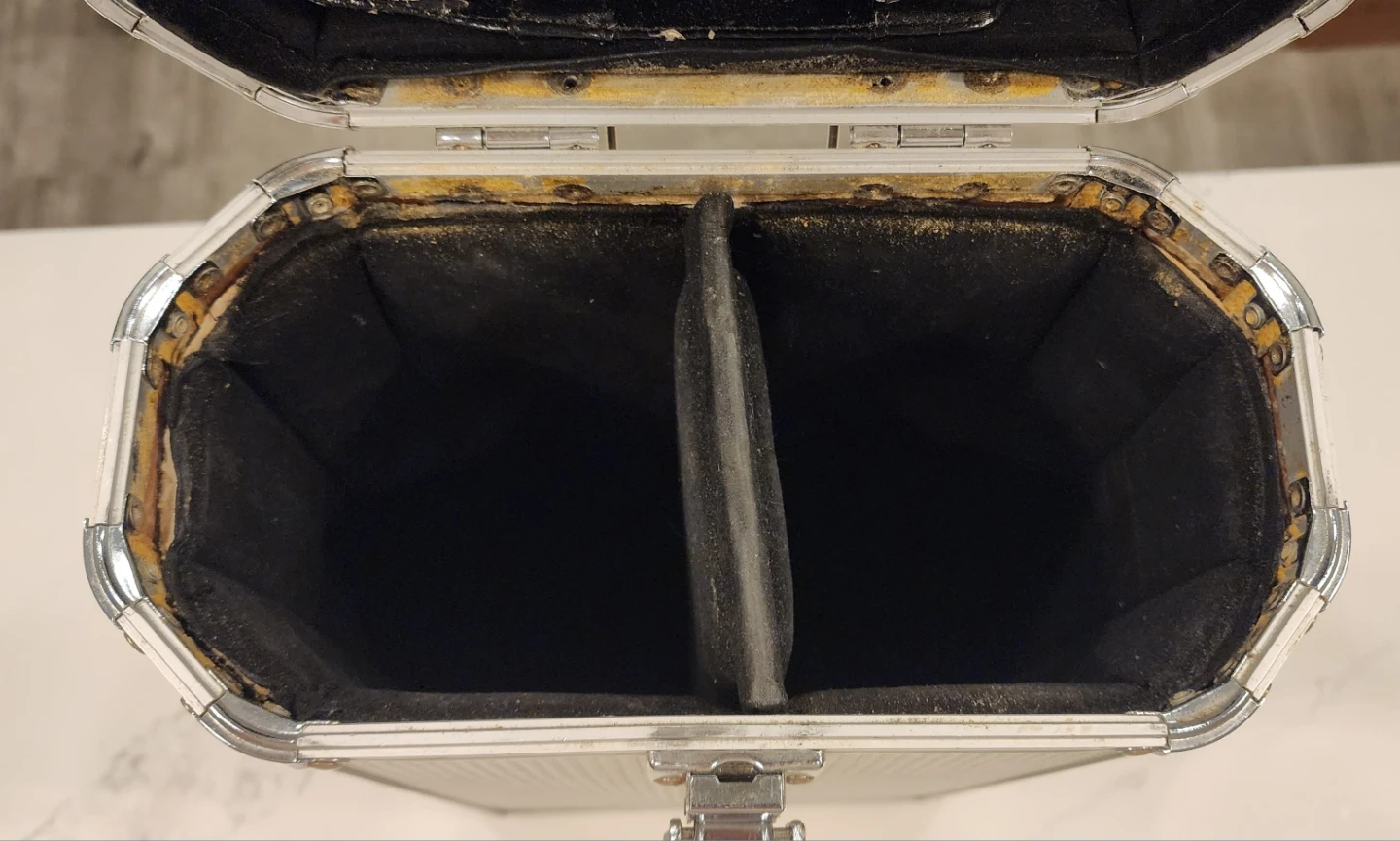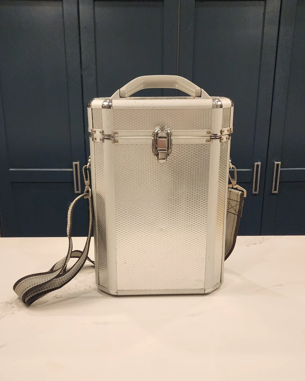26Selling a wine carrying case made from an innovative aluminum outer shell. This case has an insulated section for two bottles of wine and a pocket to carry a stainless waiter-style corkscrew. Comes with removal shoulder strap. Does show signs of wear, but fully functional; protects and insults wine.