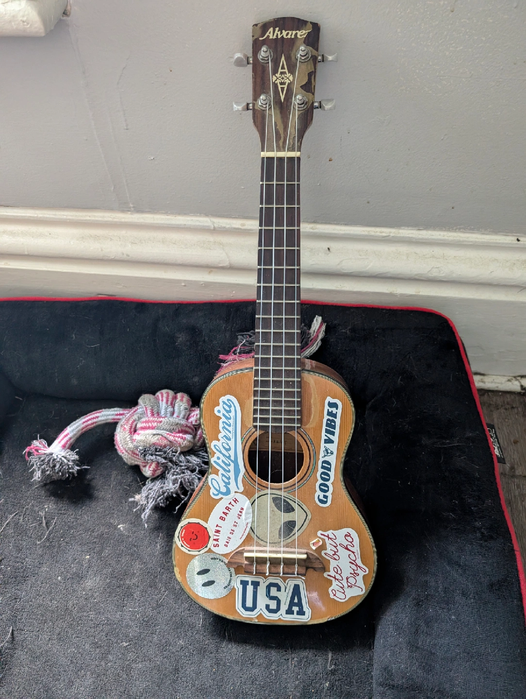 Selling an Alvarez ukulele that's been well-loved and decorated with fun stickers! It's in good condition and ready for someone to make some music with it