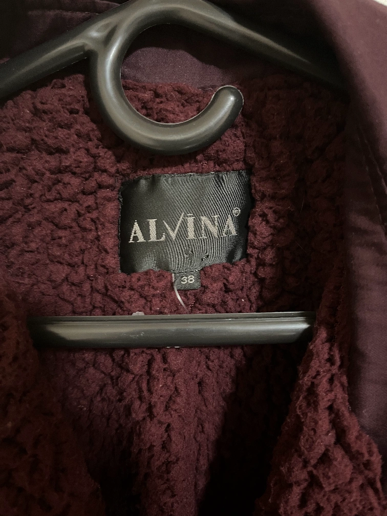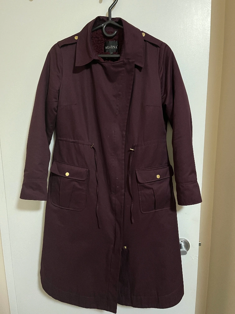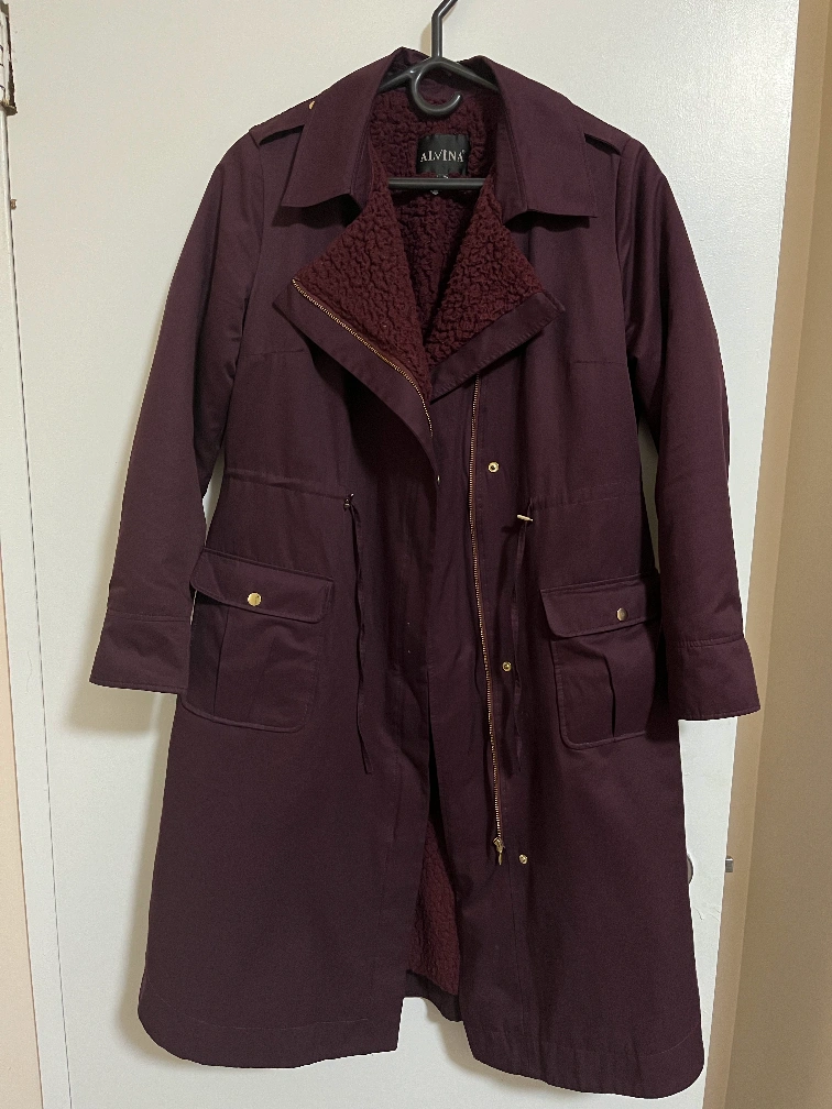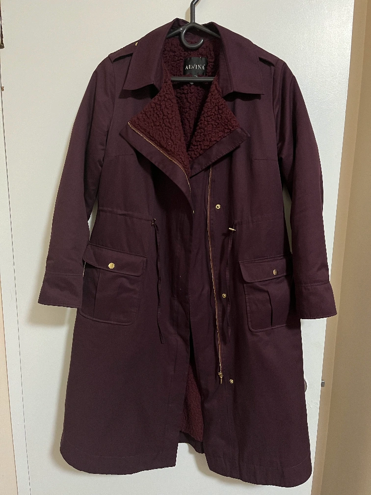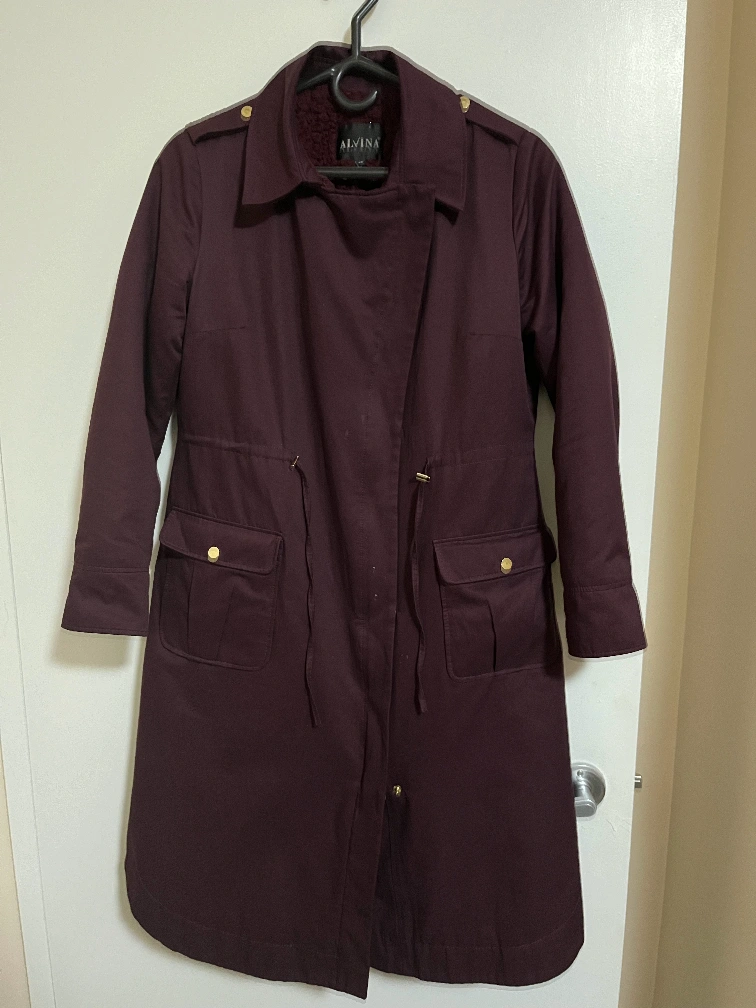 This is a burgundy anorak with a zipper closure, two front pockets, and a hood. It is lined with fleece.