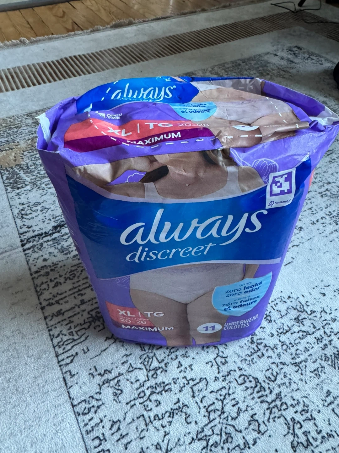 69Selling a new, unopened package of Always Discreet Underwear. Size XL (20-26), and there are 11 pairs in the package. Provides maximum protection with zero leaks and zero odor