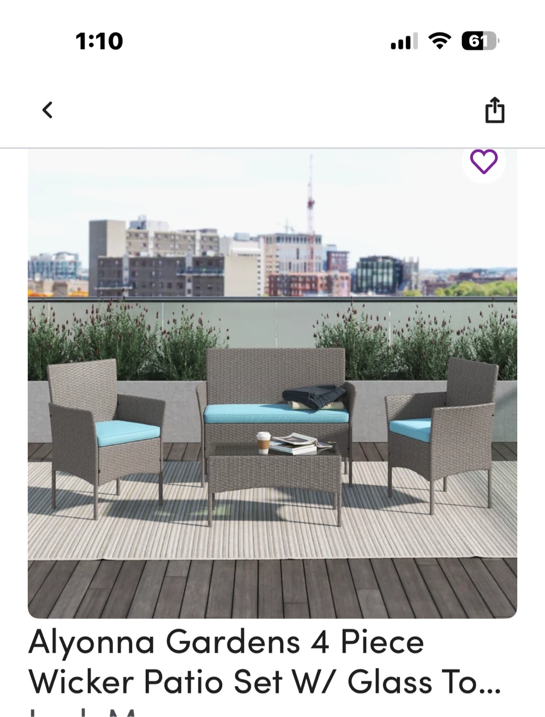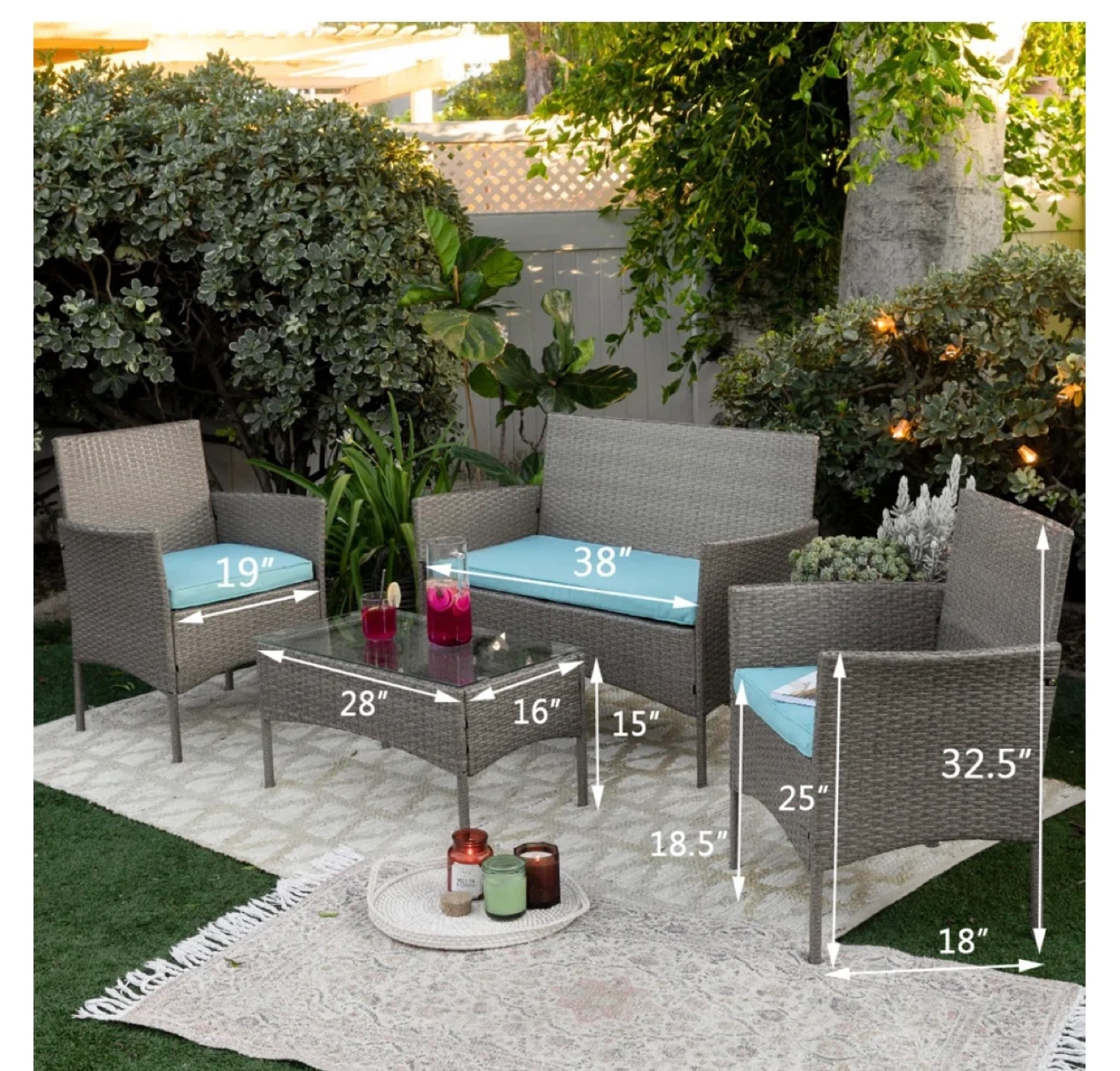 Looking to spruce up your outdoor space? I'm selling a lovely 4-piece rattan patio furniture set. It includes a loveseat, two chairs, and a glass-topped coffee table. The cushions are a nice light blue. The loveseat is 38 inches wide, the chairs are 19 inches wide, and the table is 28x16 inches. Perfect for enjoying those warm summer evenings!
