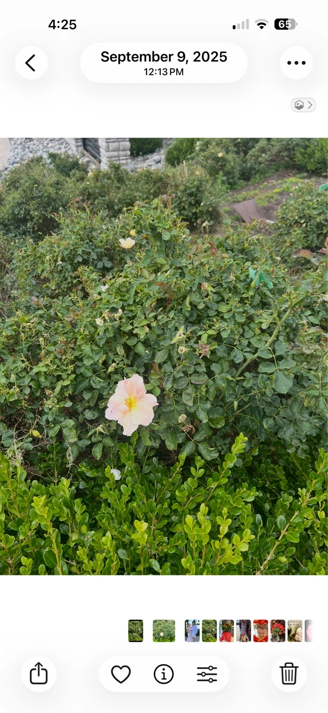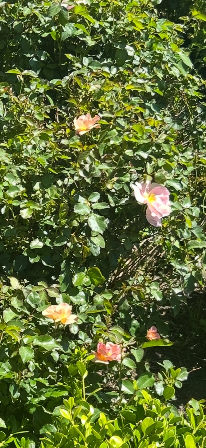 A lovely rose bush featuring delicate pink and yellow blossoms. It's a vibrant addition to any garden! The bush is healthy and well-established. This would be a wonderful plant for someone looking to add some natural beauty to their outdoor space. And they are free come dig them out