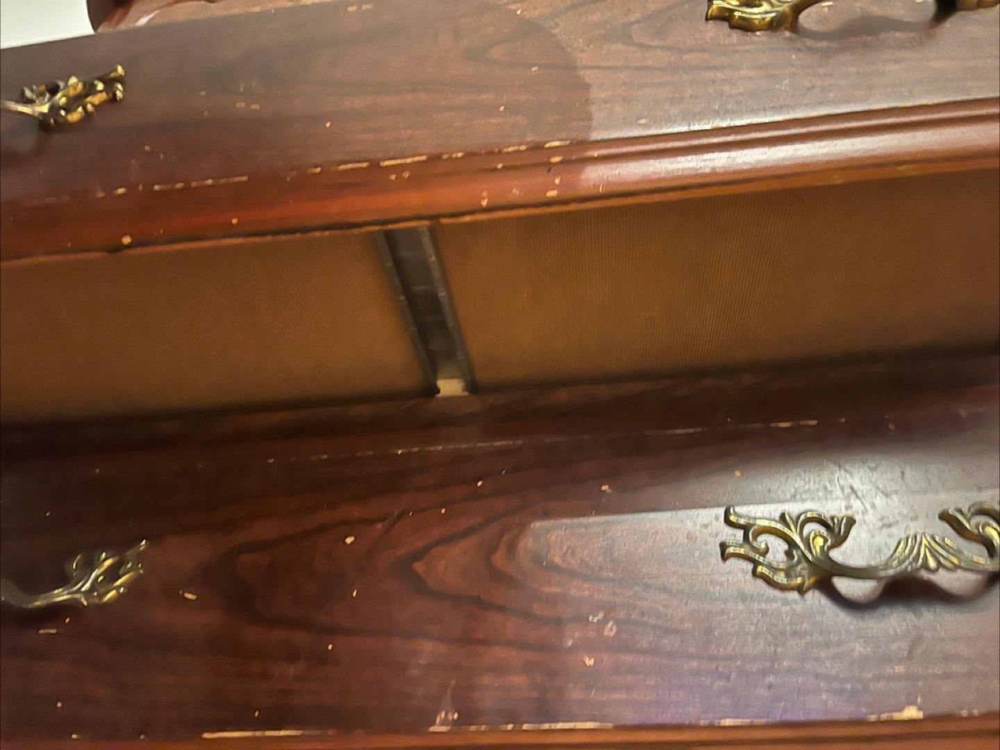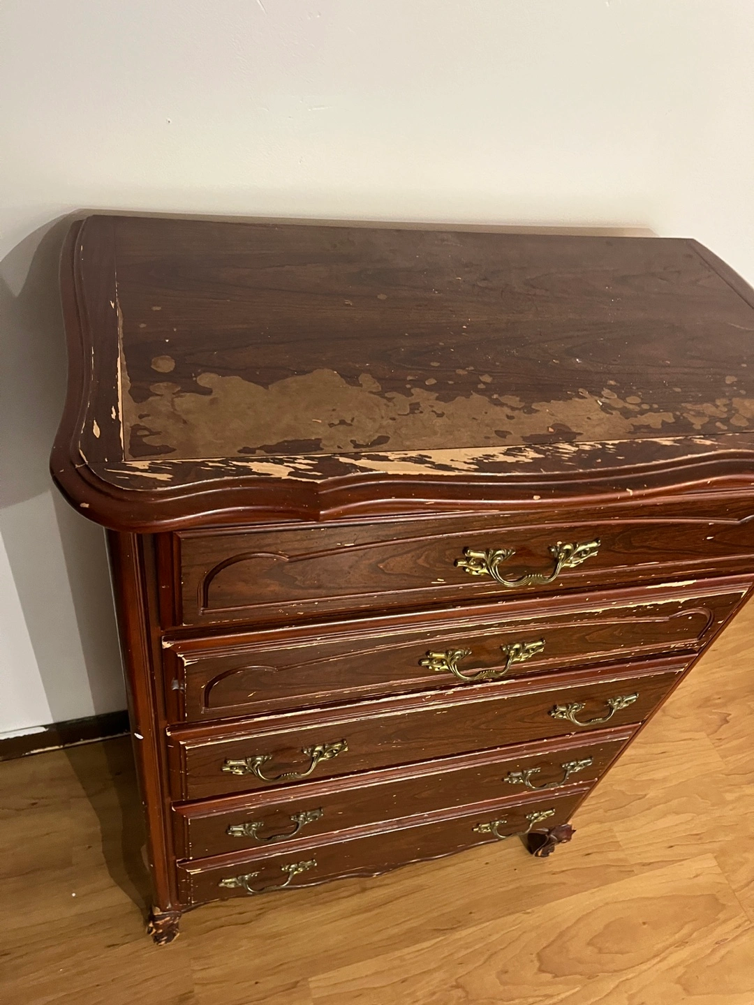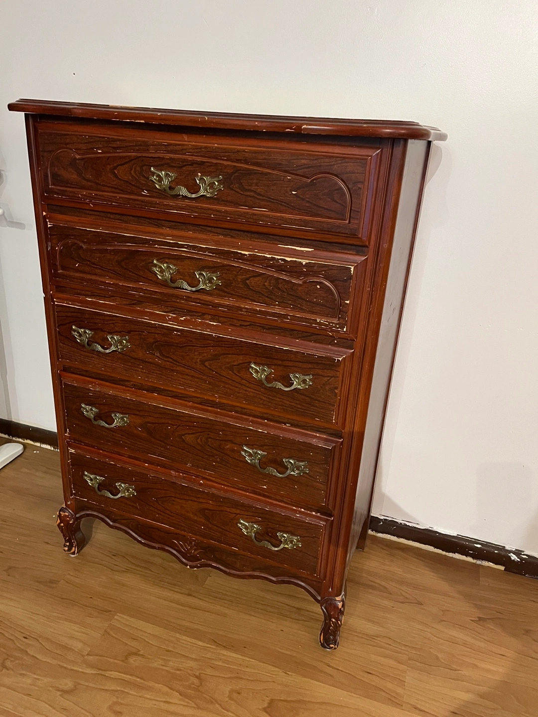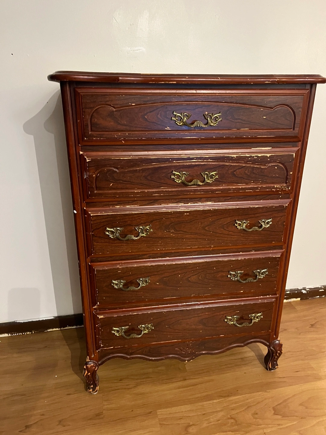 A vintage wooden chest dresser with five drawers. It's finished in a dark wood tone with ornate brass-style drawer pulls. Shows some wear consistent with its age, particularly on the top surface and drawer edges. Solid wood. It can look new if you paint on it.