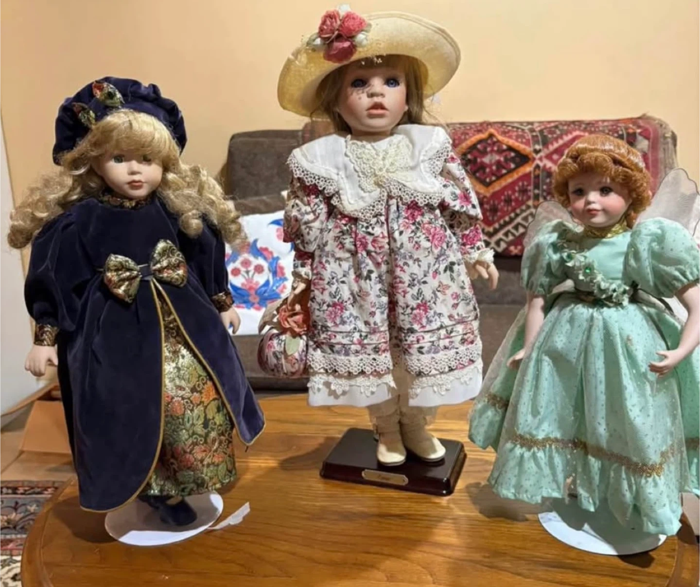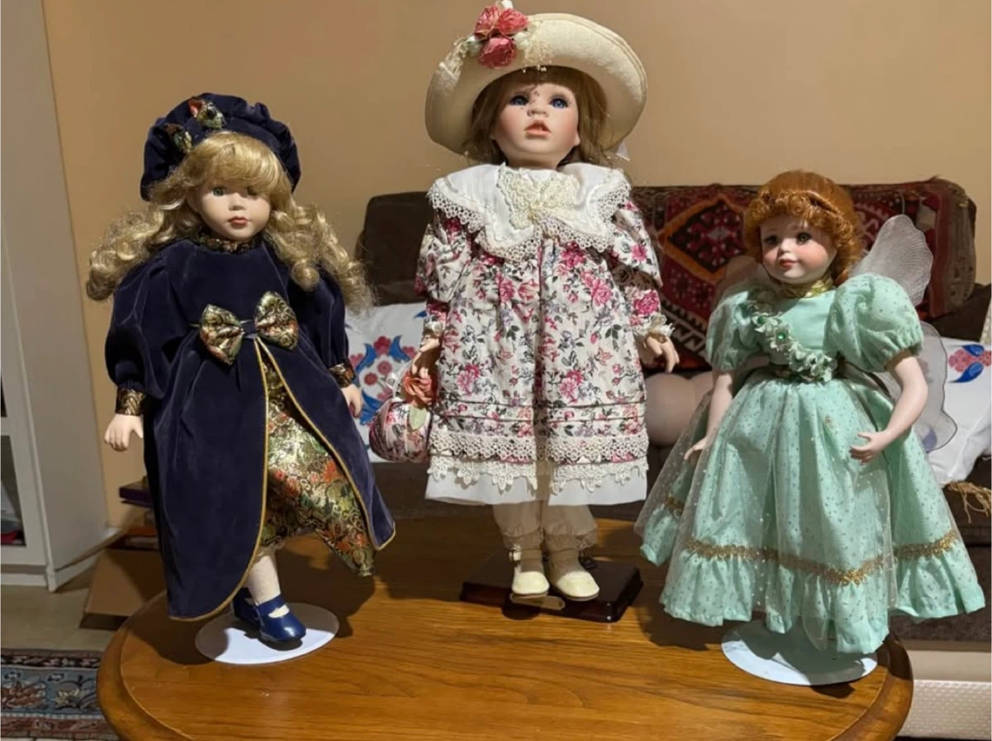 Selling a set of three collectible porcelain dolls. They are all dressed in unique outfits and come with stands. These dolls would make a great addition to any collection!