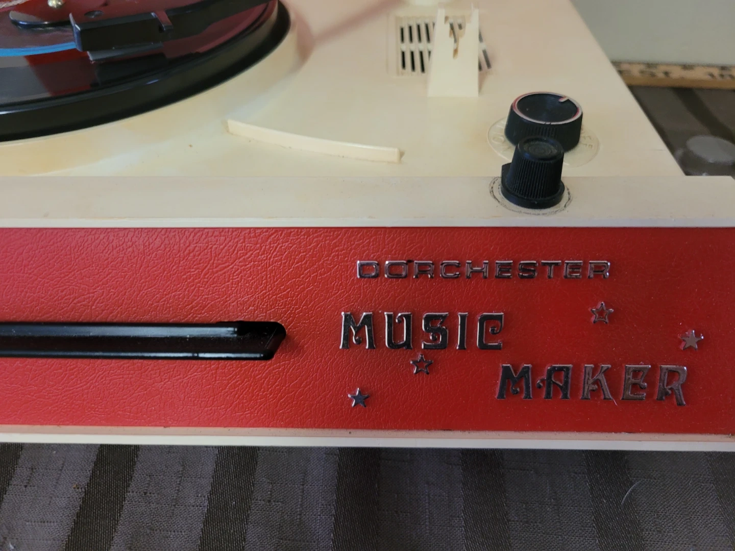 Vintage Dorchester Music Maker portable record player. Plays 33 and 45 RPM records. Cream and red colour. Perfect for listening to your vinyl collection!