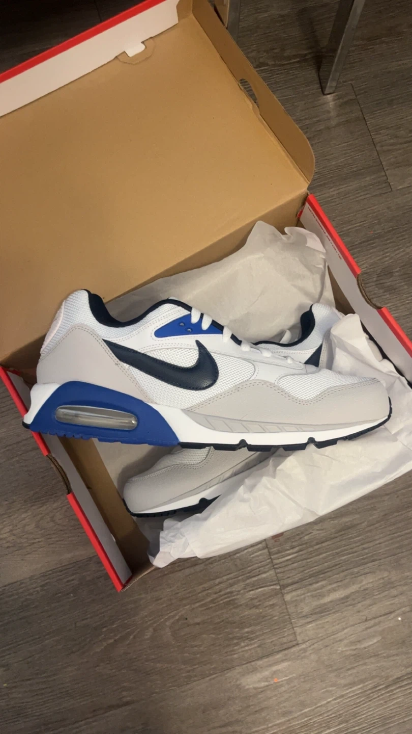 Classic white, grey, and blue Nike Air Max sneakers. These shoes come in their original box with tissue paper. They're a stylish and comfortable option for everyday wear.