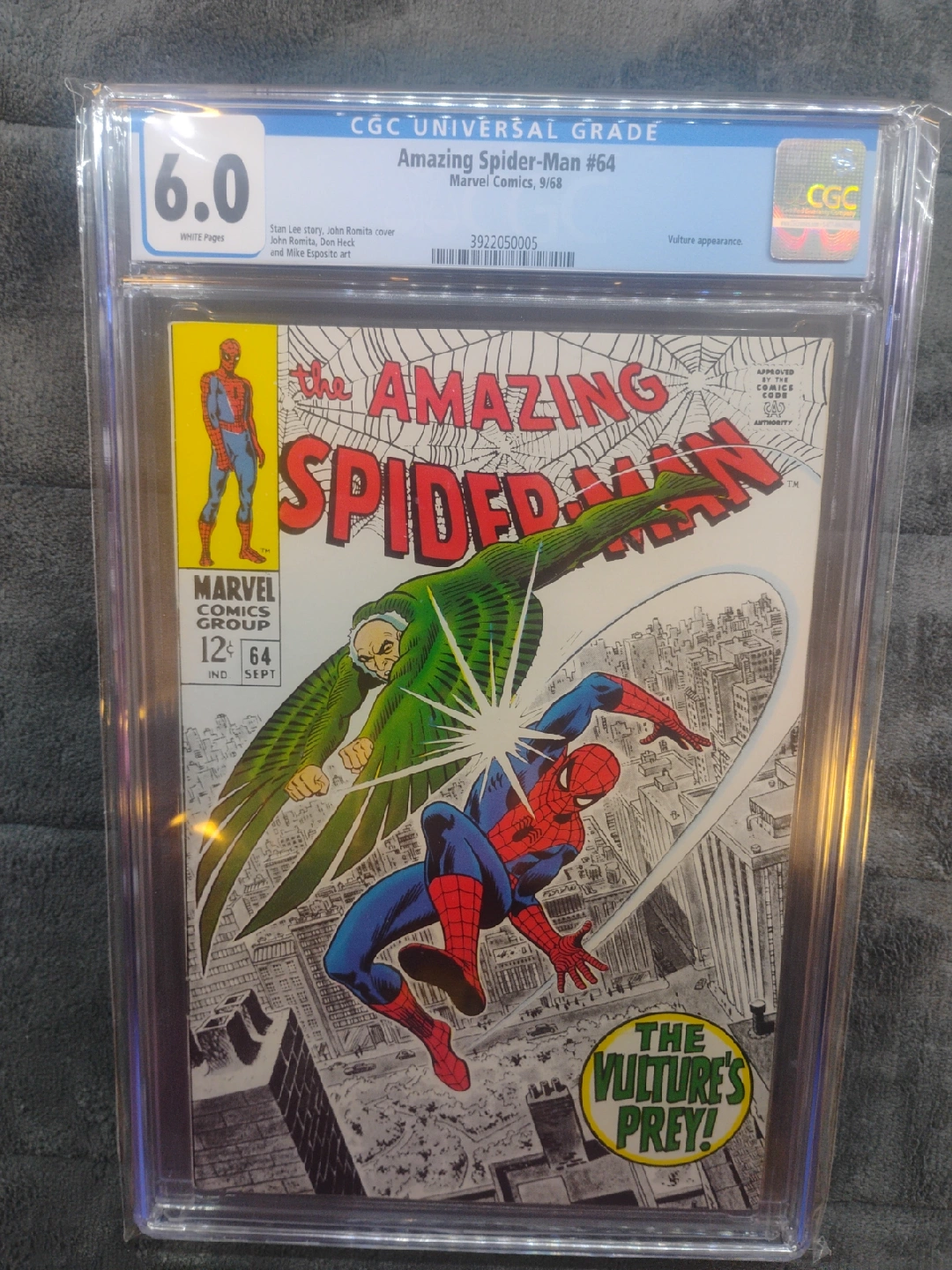 Selling Amazing Spider-Man #64, graded 6.0 by CGC Universal Grade. Features the Vulture appearance. A classic Marvel comic from September 1968, with art by Stan Lee, John Romita, Don Heck, and Mike Esposito