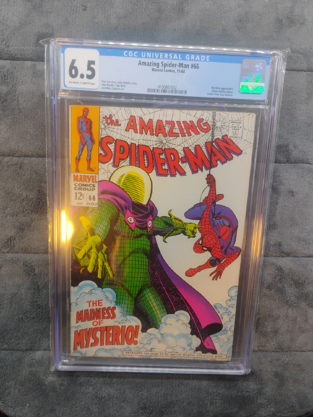 Selling Amazing Spider-Man #66, graded 6.5 by CGC Universal Grade! This Marvel comic from November 1968 features a Stan Lee story and John Romita cover. You'll see Mysterio and a Green Goblin cameo in this issue! It's in off-white to white pages.