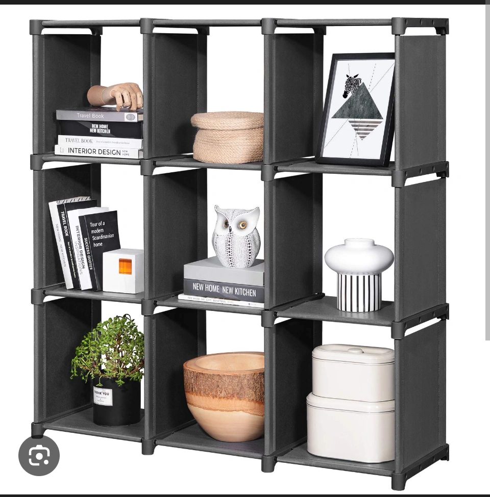 9-cube modular storage shelves from Amazon. Comes with all rods, fabric panels, connectors, and the original manual. Fully complete set and in good condition. Easy to assemble and great for clothes, shoes, or general storage. Pick up only