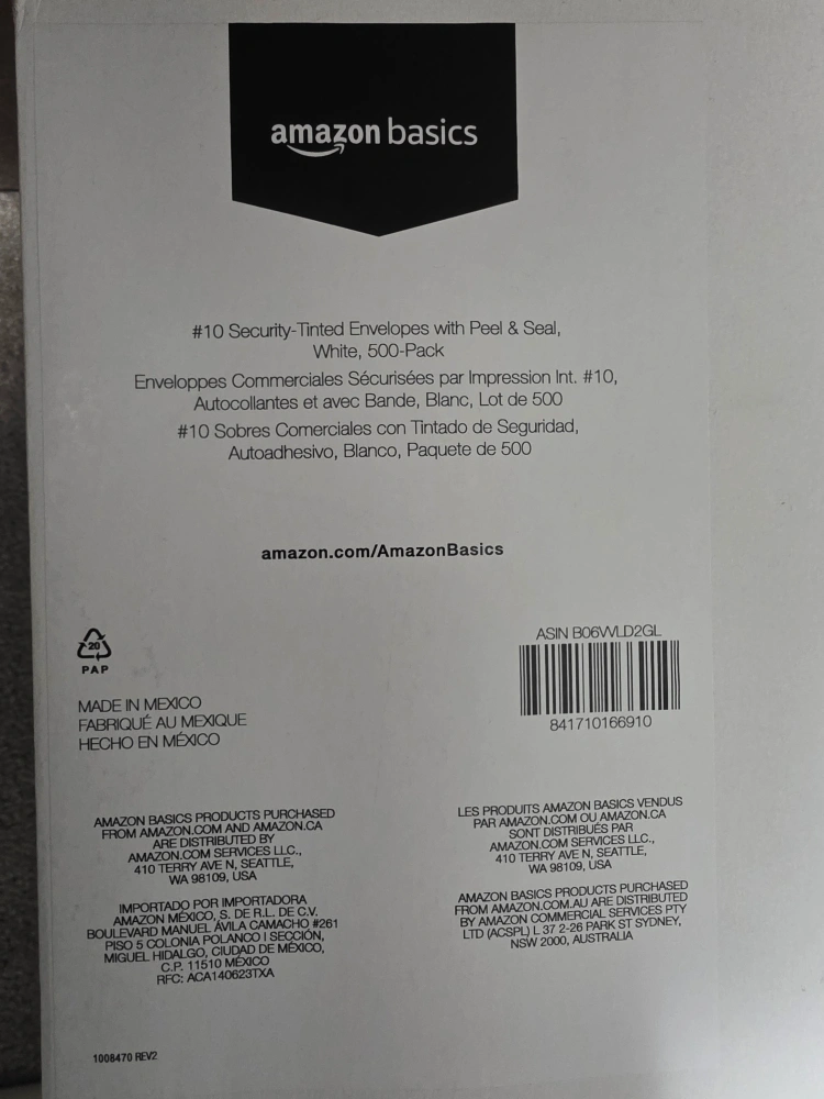Selling a pack of Amazon Basics #10 Security-Tinted Envelopes with Peel & Seal. This is a 500-pack of white commercial envelopes.