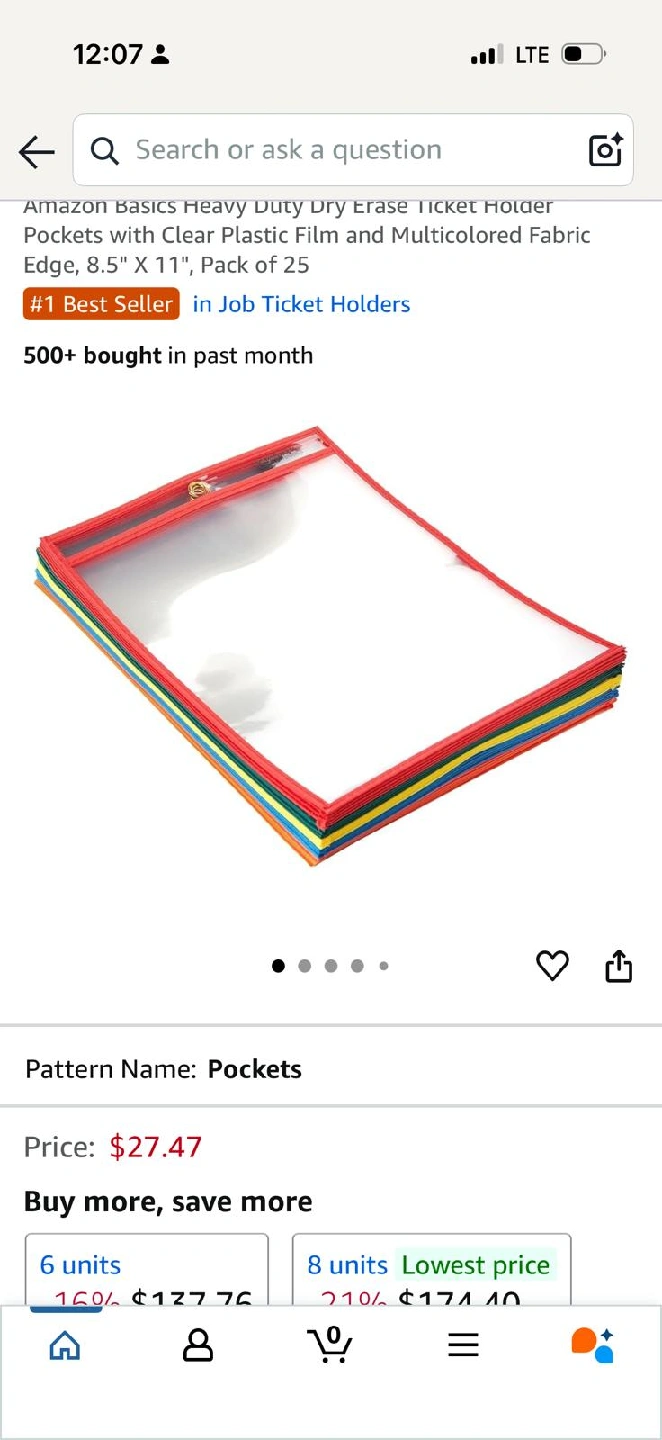 Selling a pack of 25 Amazon Basics Heavy Duty Dry Erase Ticket Holder Pockets with Clear Plastic Film and Multicolored Fabric Edge, 8.5" X 11". Originally priced at $27.47.
