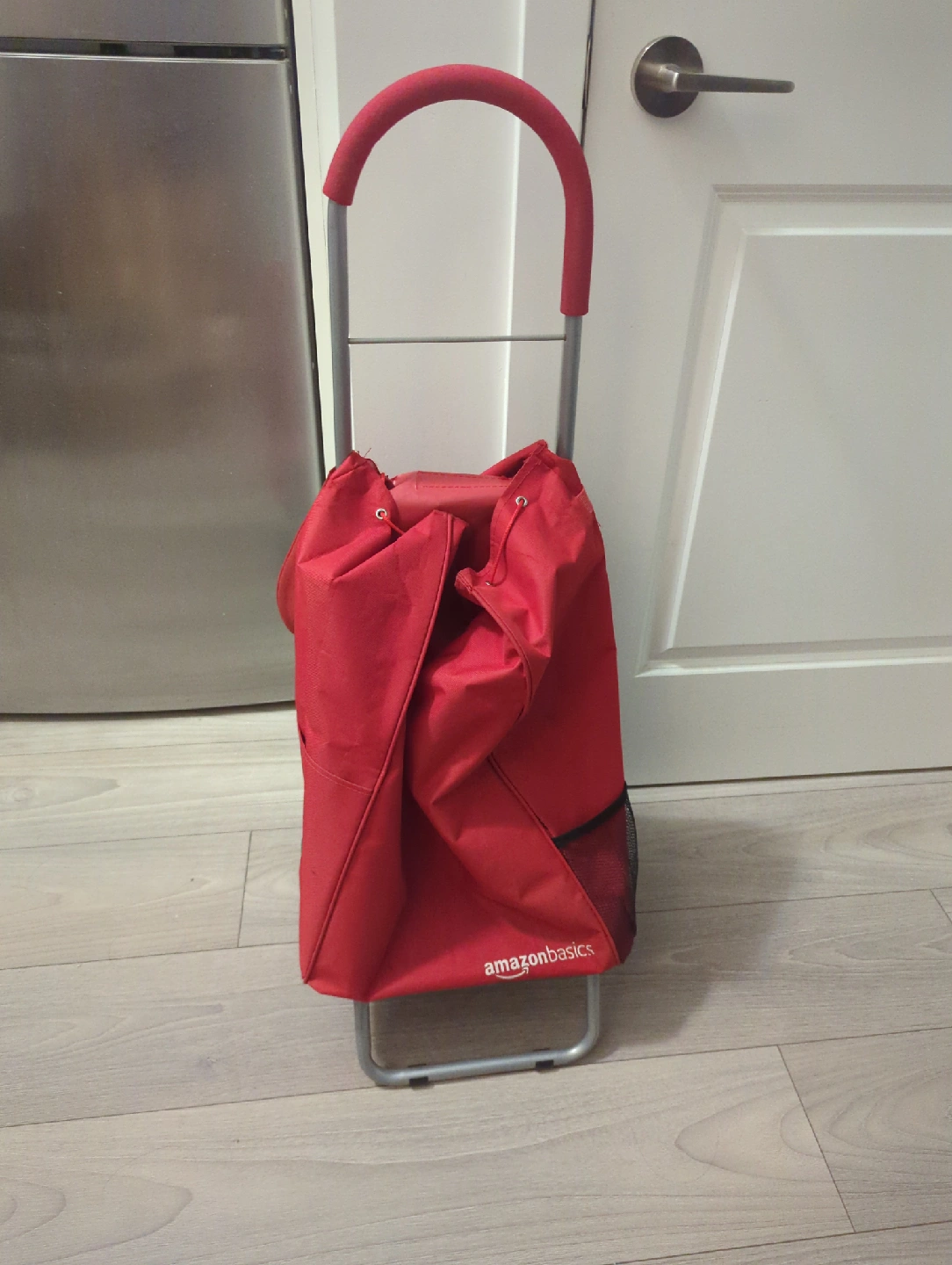 This red folding shopping cart from Amazon Basics is perfect for trips to the grocery store or farmers market! It's lightweight and portable, making it easy to carry and store. The bag is a vibrant red colour and is in great shape!
