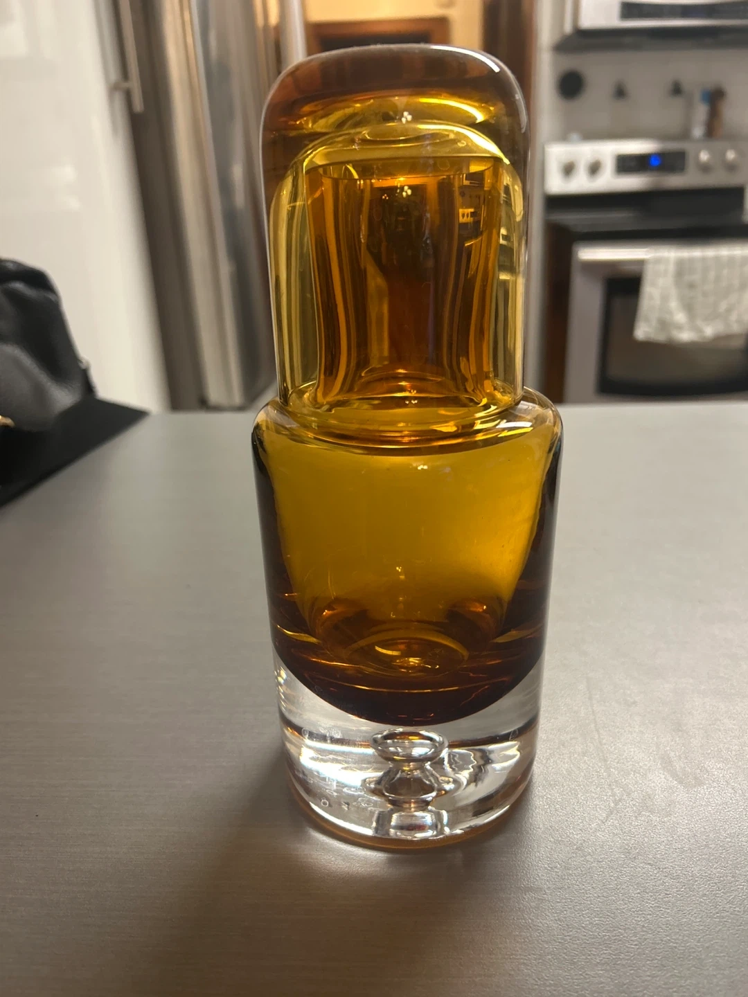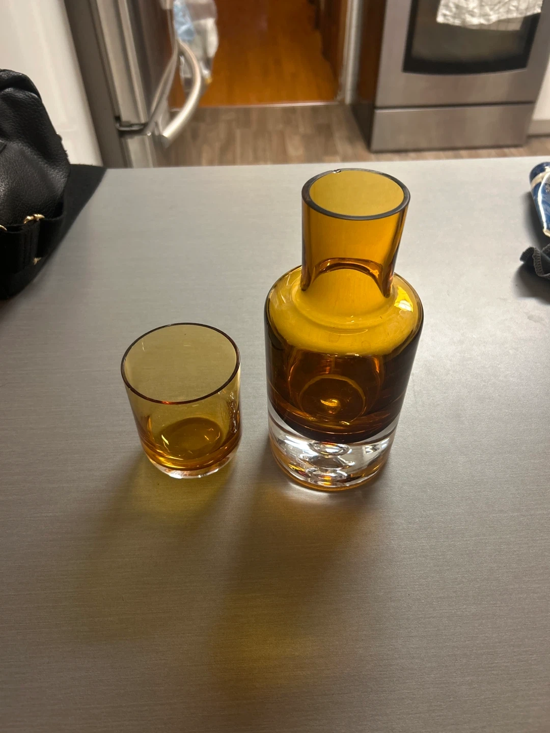 71This is a beautiful amber glass carafe that comes with its own tumbler cup that fits nicely on top. It's perfect for bedside water, juice, or even a small batch of cocktails. The set is in excellent condition and would make a lovely addition to any home