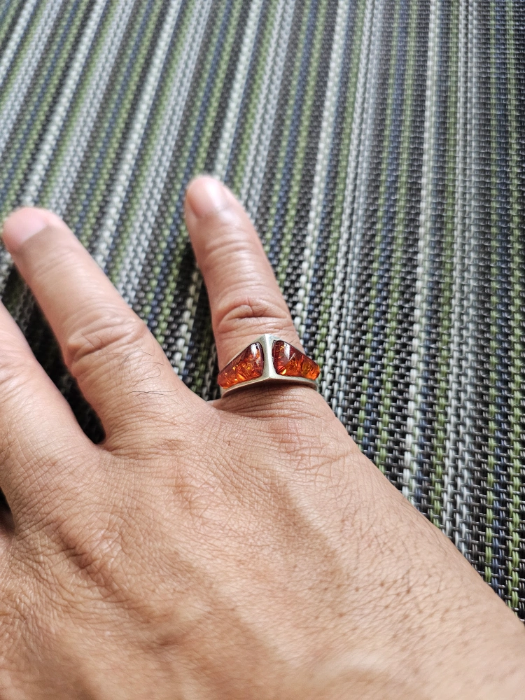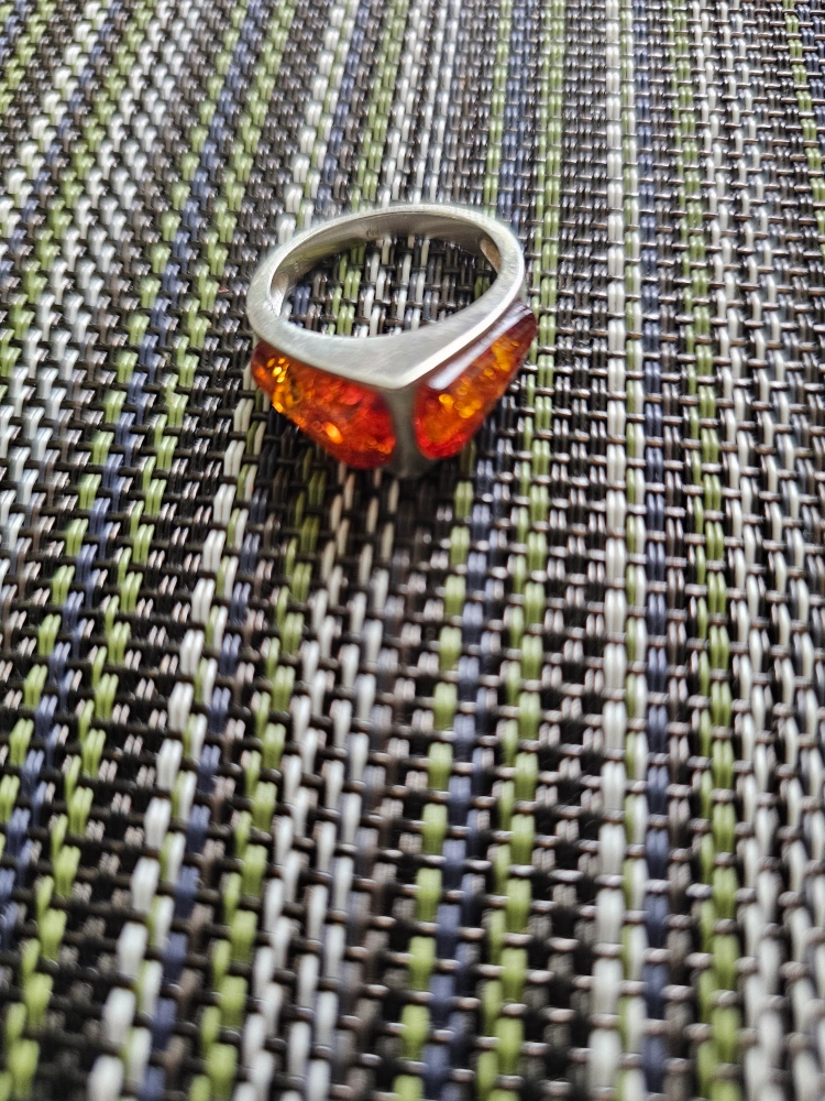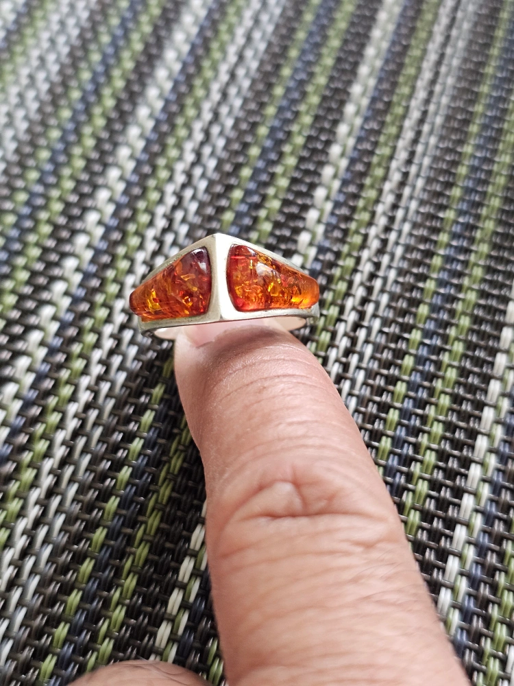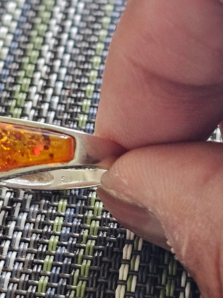Selling a ring with an amber stone set in 925 silver. It's a unique piece that would look great! The silver is marked with '925', indicating its silver content.
