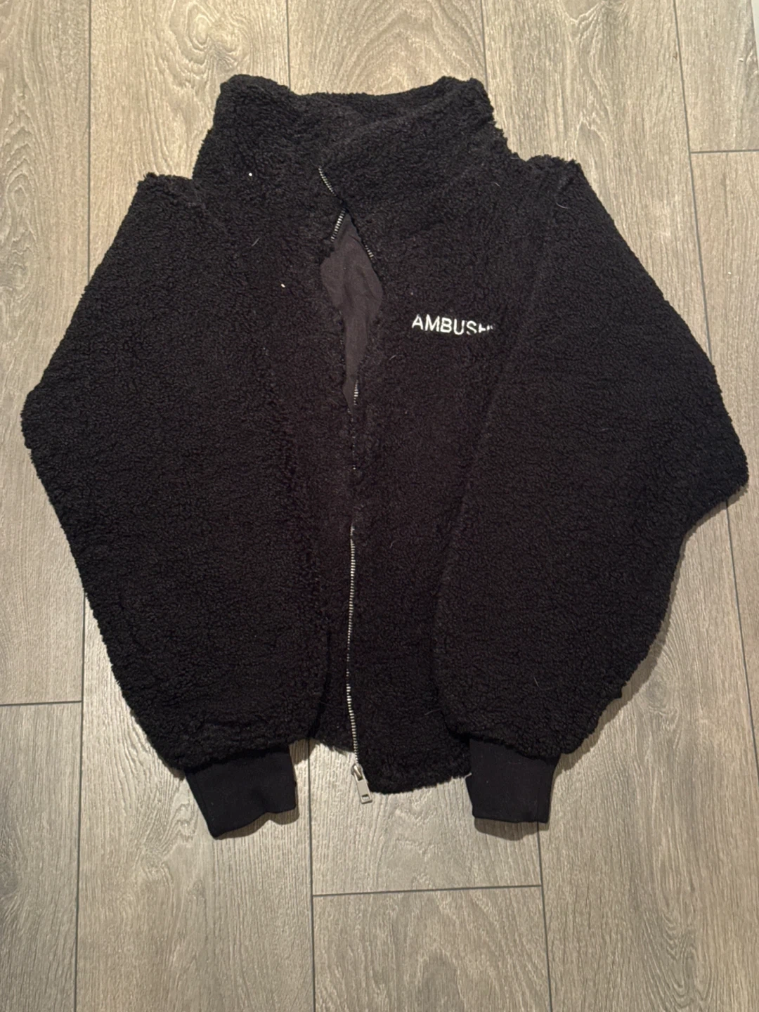 103Selling a cozy Ambush black fleece jacket! It's in great condition and perfect for staying warm on chilly days. The fleece material is super soft and comfortable.