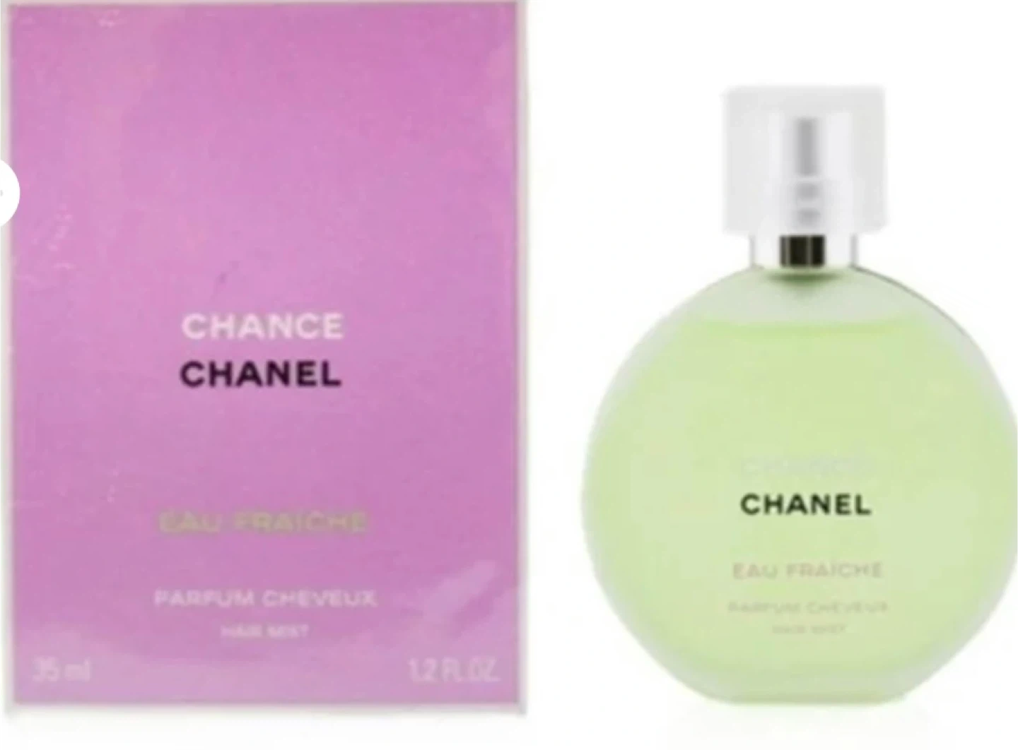 This is Chanel Chance Eau Fraiche hair mist. It comes in a 35ml bottle, which is 1.2 fl. oz. Great for refreshing hair with a subtle scent! Pick up near the border of Brampton and Caledon