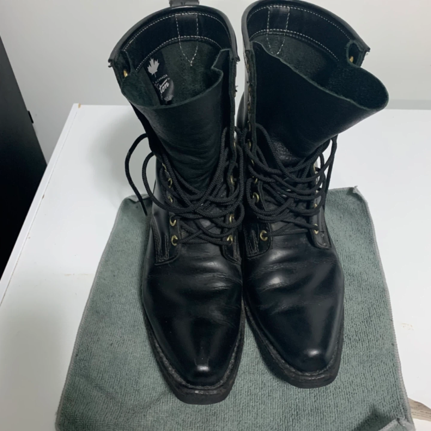 Black leather Dayton work boots made in Canada. These boots have a lace-up front and a sturdy design. They're built for durability and comfort on the job. A reliable choice for tough work environments!