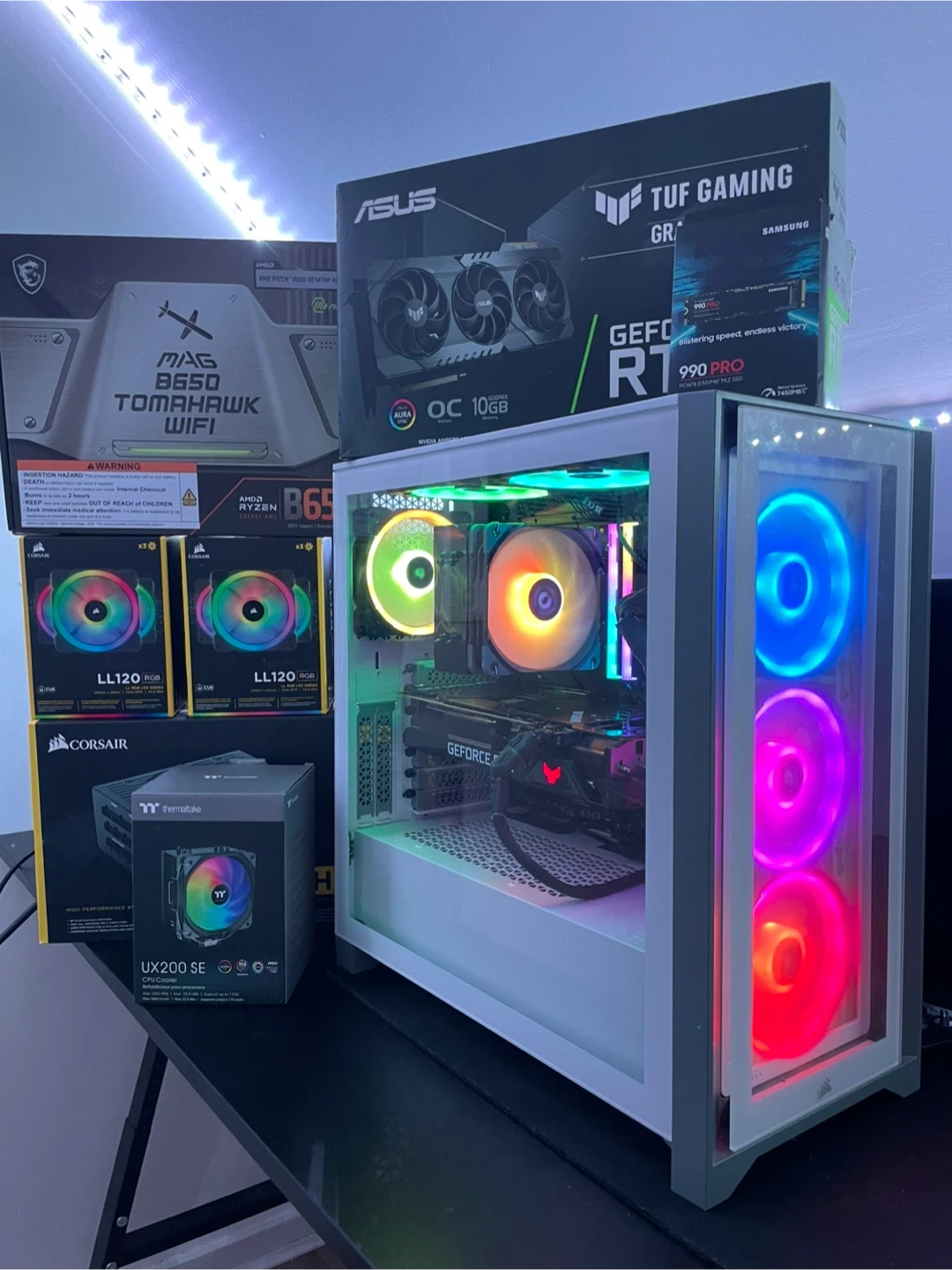 10Brand new gaming PC build, all parts new including the GPU. Powerful Gaming PC with unique looking/high quailty Mid ATX case. Extremly good price It’s worth $2200+ I’ll include a roccatt Vulcan keyboard & razer ultimate wireless/wired mouse for free with it, $200+ worth of gear. CPU: AMD Ryzen 7 7800X3D GPU: Asus TUF RTX 3080 Super 12GB Storage: Samsung 990 PRO 1TB NVMe Gen4 (7300/6800 MB/s, DRAM Cache) Motherboard: MSI B650 Tomahawk Max (AM5, WiFi 6E) RAM: XPG DDR5 32GB (2x16GB) 6000 MHz Cooling: Thermaltake UX200 SE CPU Cooler Fans: 6x NZXT LL120 + extra side-mounted fans PSU: Corsair HX1200, Fully Modular, 80+ Platinum Case: NZXT 4000X Mid Tower System is completely tested, fully activated Windows 11 Thx for looking price is negotiable within reason