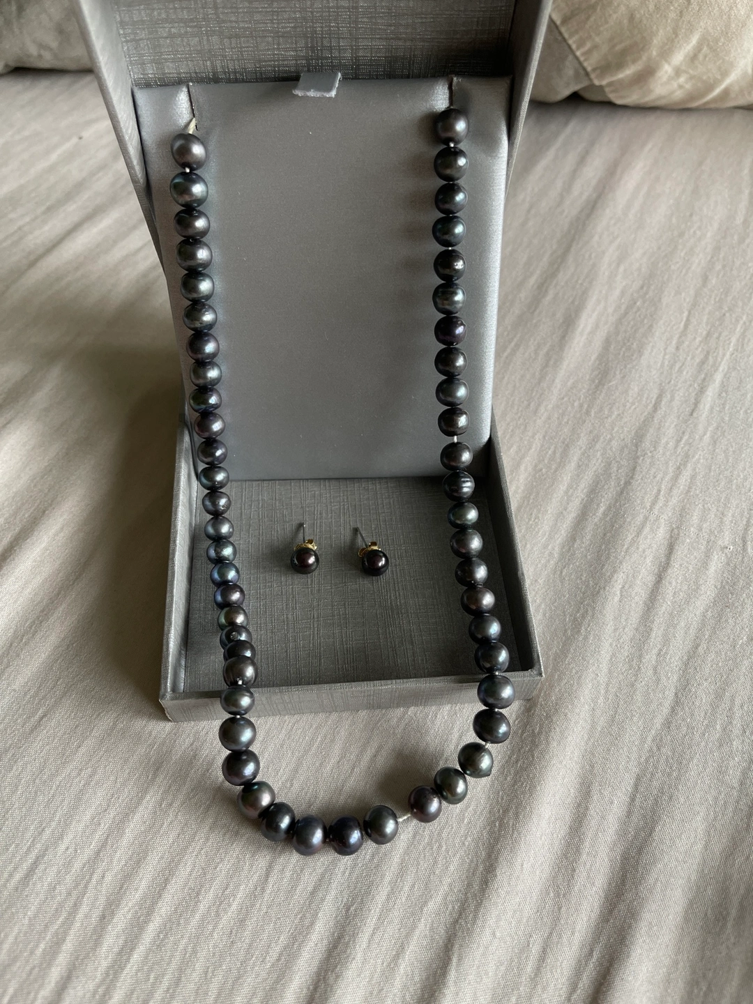 It’s a black pearl necklace and earring set brought from Nepal.I don’t have a proof of authenticity but I can tell that when you scratch the beads the skin doesn’t come off.it still remains the same.open for offer