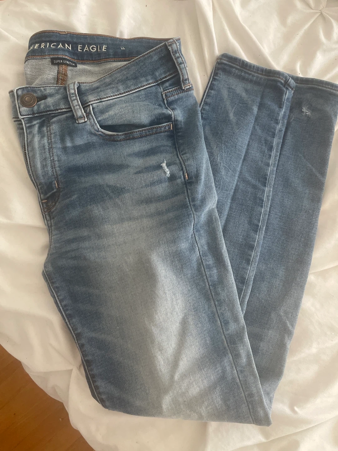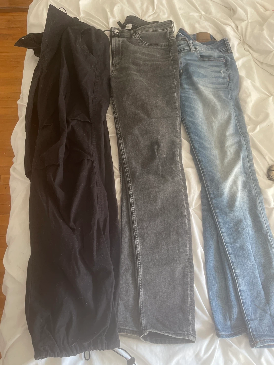 Selling a few pairs of jeans and cargo pants! There's a pair of light wash American Eagle super stretch jeans, a pair of black H&M jeans and black pair of cargo pants size L but fits like medium ! Great for everyday wear!