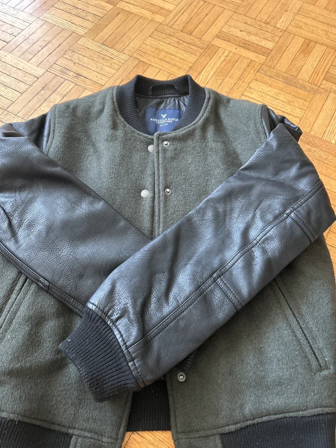 Selling an American Eagle varsity jacket! It features an olive green wool blend body and black faux leather sleeves. Perfect for layering during the cooler months!