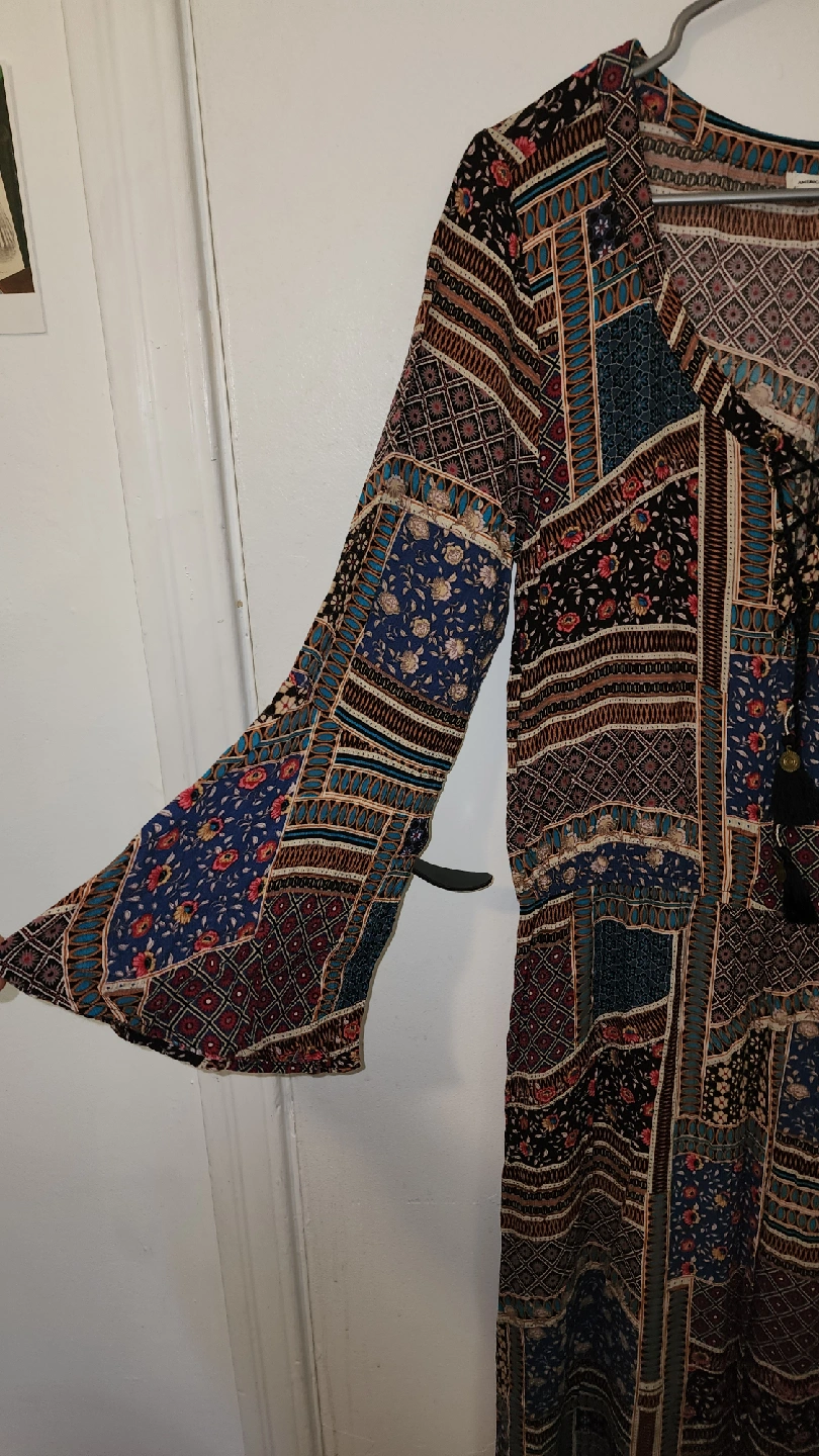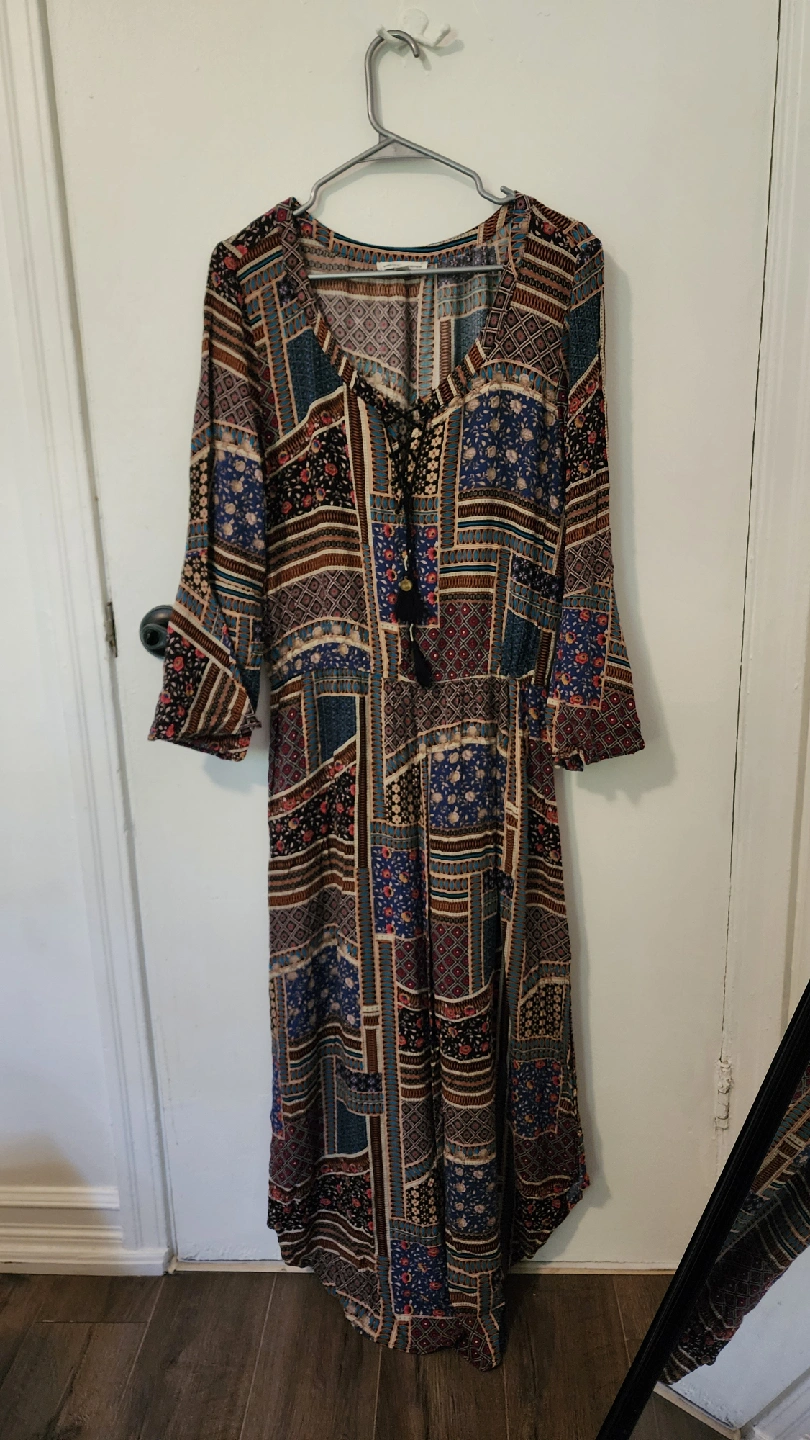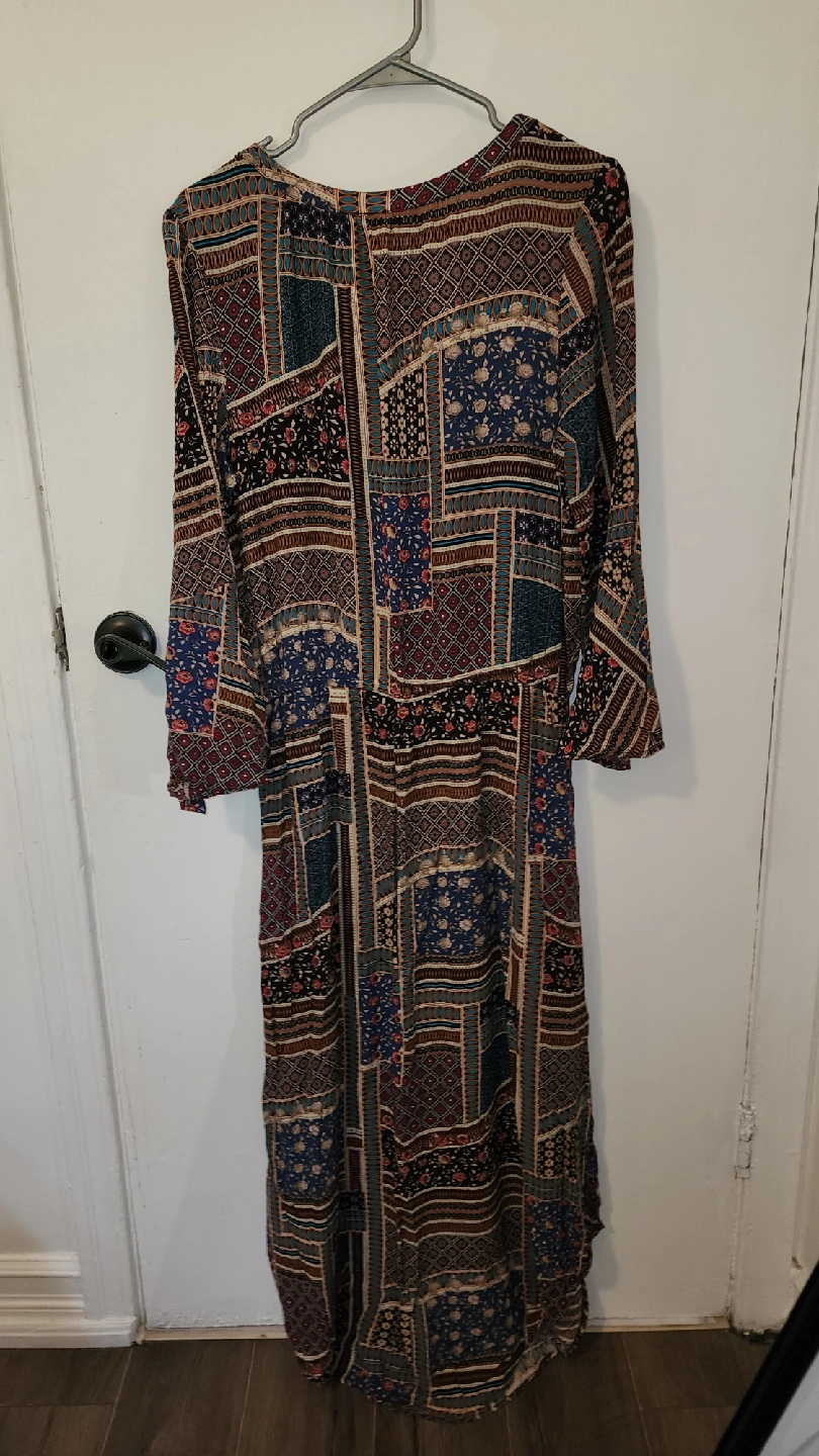 This is a beautiful dress from American Eagle Outfitters in size large. The dress has a unique patchwork pattern with a mix of colours. It's in great condition and ready for a new home!