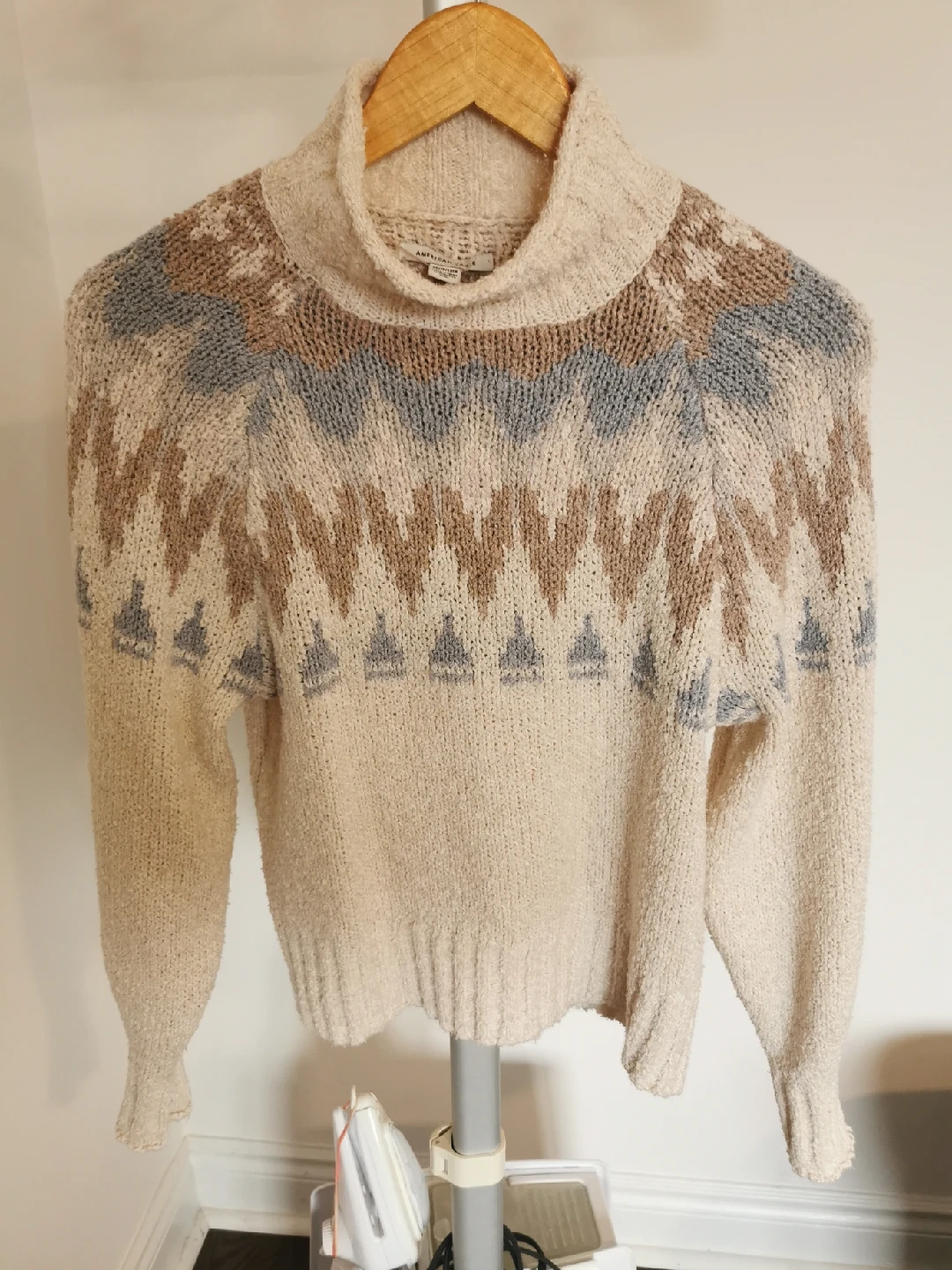187Cozy up in this American Eagle sweater. It's a size XS and features a unique pattern with neutral tones.