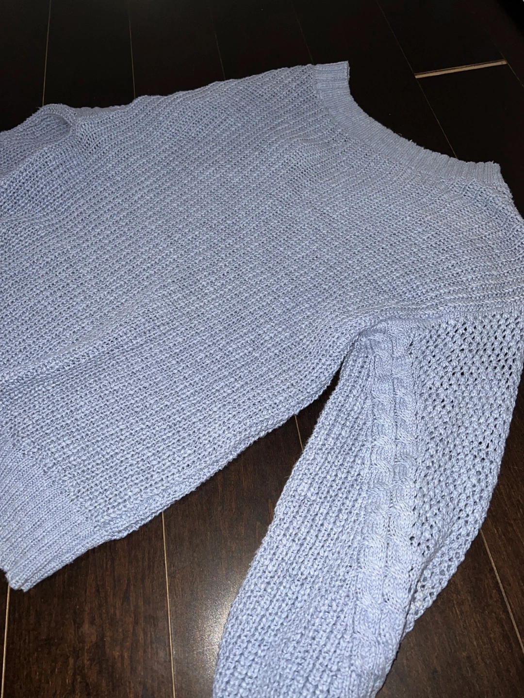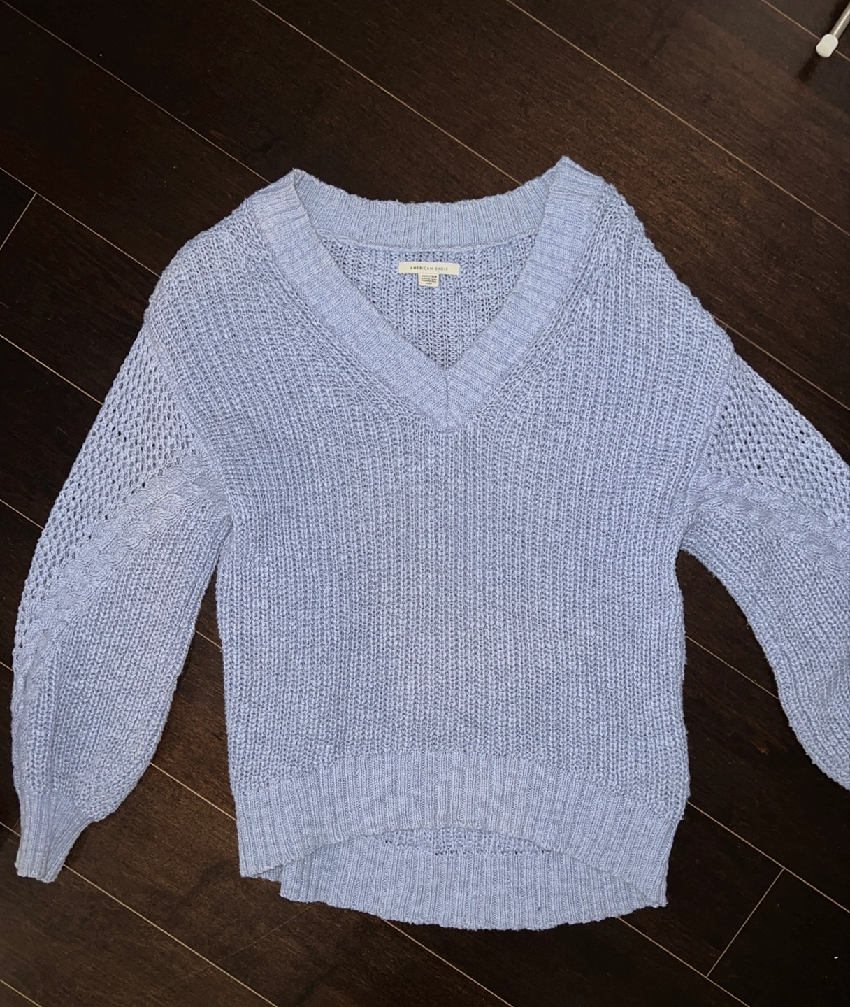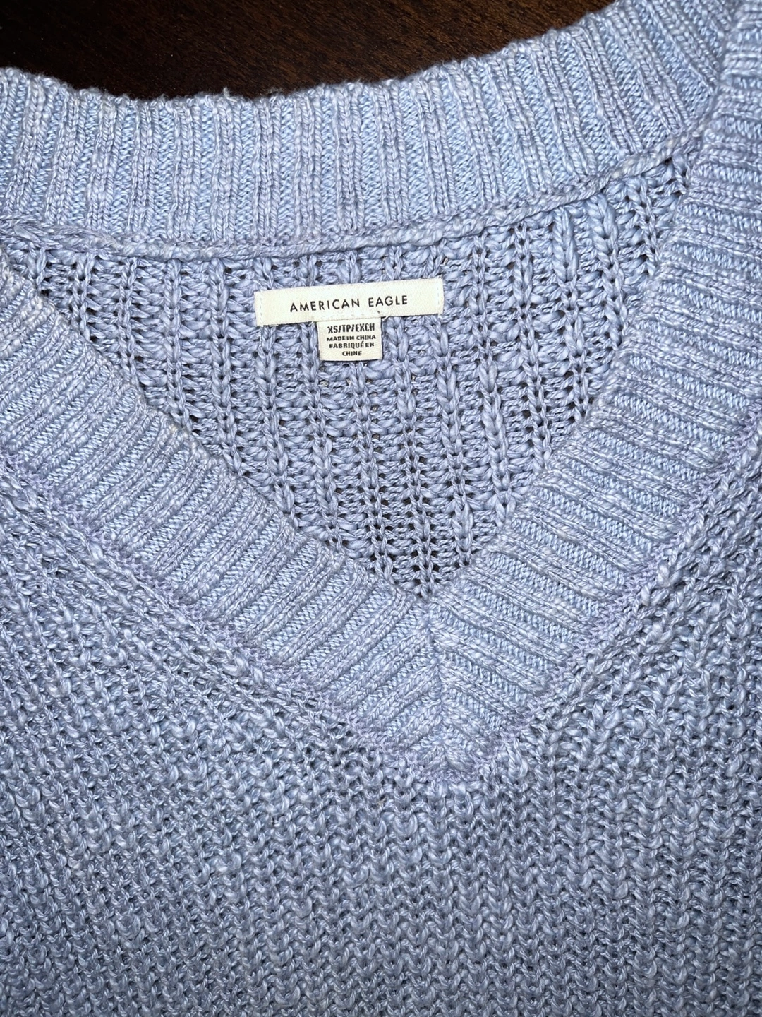 Light blue V-neck sweater with long sleeves. Knitted with a cable pattern. Size XS but runs big Pick up only