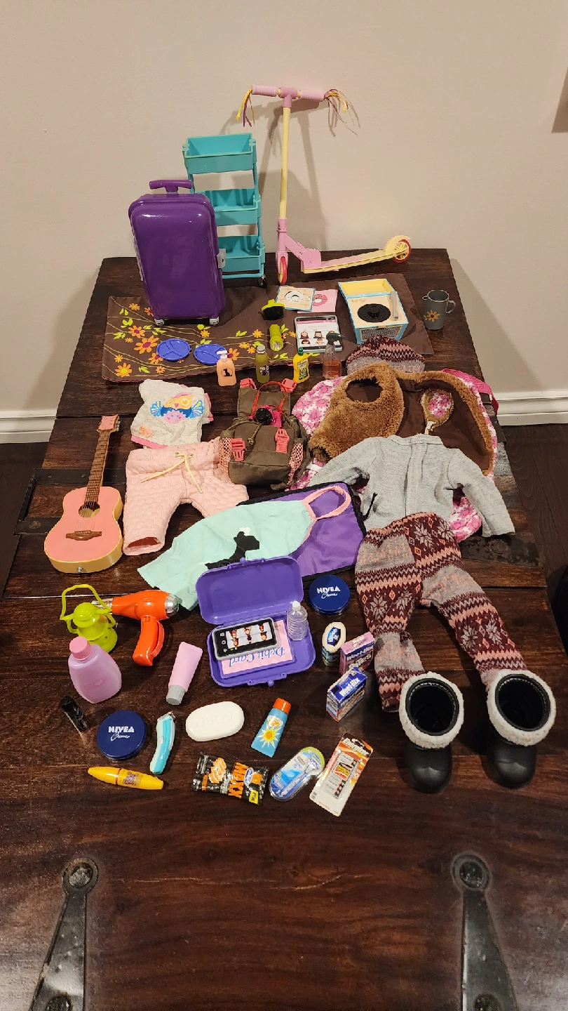 126A collection of doll accessories including clothing, shoes, and other items. Perfect for imaginative play!