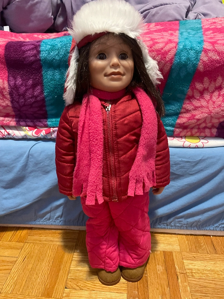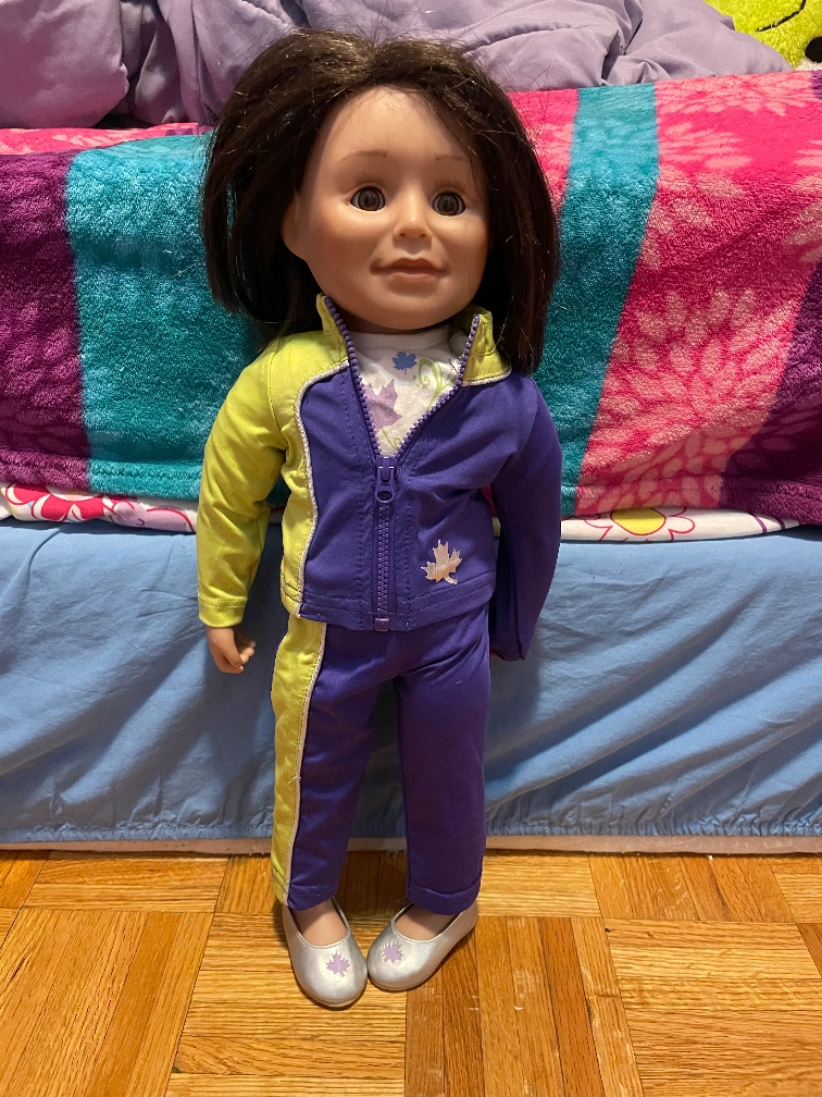 Selling a MAPLELEA doll. She comes with a cute purple and yellow tracksuit and silver shoes. as well as a winter outfit. one doll, 2 outfits! Great for any doll lover!