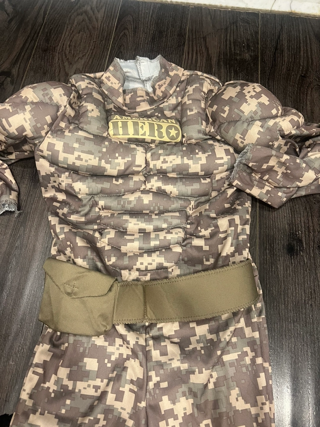 Selling an American Hero costume in a camo pattern! It has a padded chest and comes with an attached belt and pouch. Great for dress-up or Halloween!